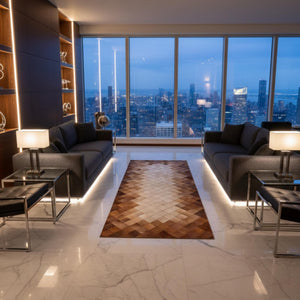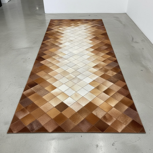 Merkez kısmında açık tonların yoğunlaştığı ve kenarlara doğru kahverengi geçişlerin yer aldığı dana derisi patchwork runner halı, uzun formuyla antre ve koridor alanlarında güçlü bir zemin etkisi sunar. Gerçek dana derisinden üretilen bu halı, doğal renk dağılımı sayesinde mekâna derinlik ve sıcaklık kazandırır.