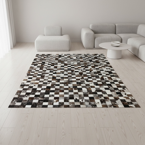 Siyah ve beyaz tonların dengeli kontrastıyla tasarlanan dana derisi patchwork halı, düzenli kare desen yapısıyla modern ve net bir zemin etkisi sunar. Gerçek dana derisinden üretilen bu halı, sade renk paleti sayesinde farklı dekorasyon stilleriyle kolayca uyum sağlar.