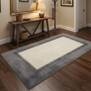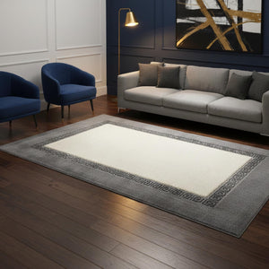 Gri Zeminli Beyaz Merkezli ve Silver Bordürlü Peluş Halı – Yumuşak Dokulu, Modern ve Dekoratif Halı