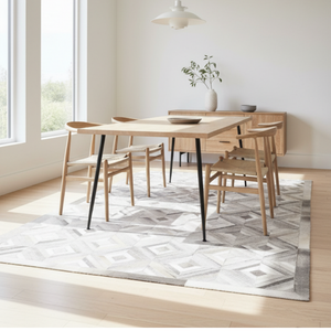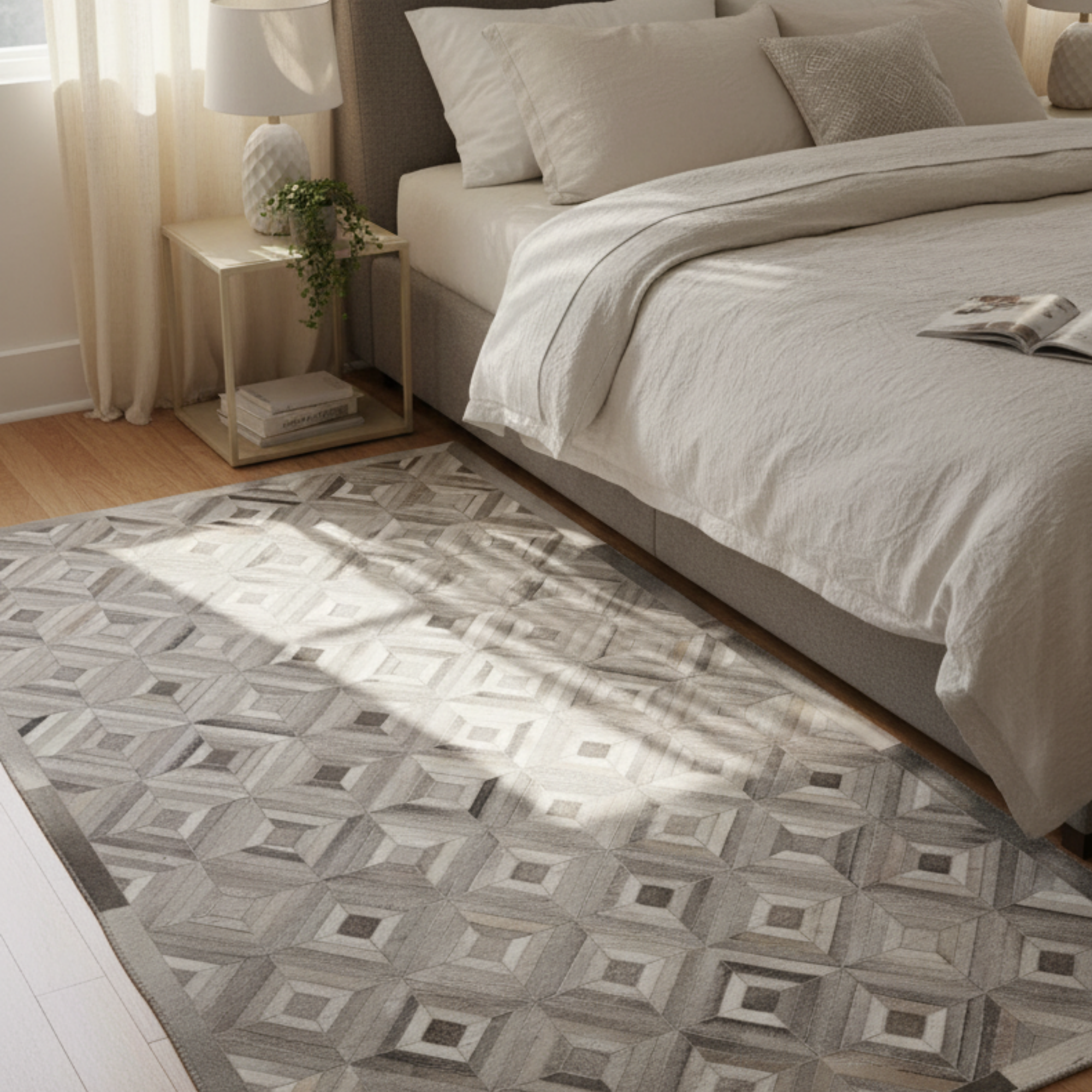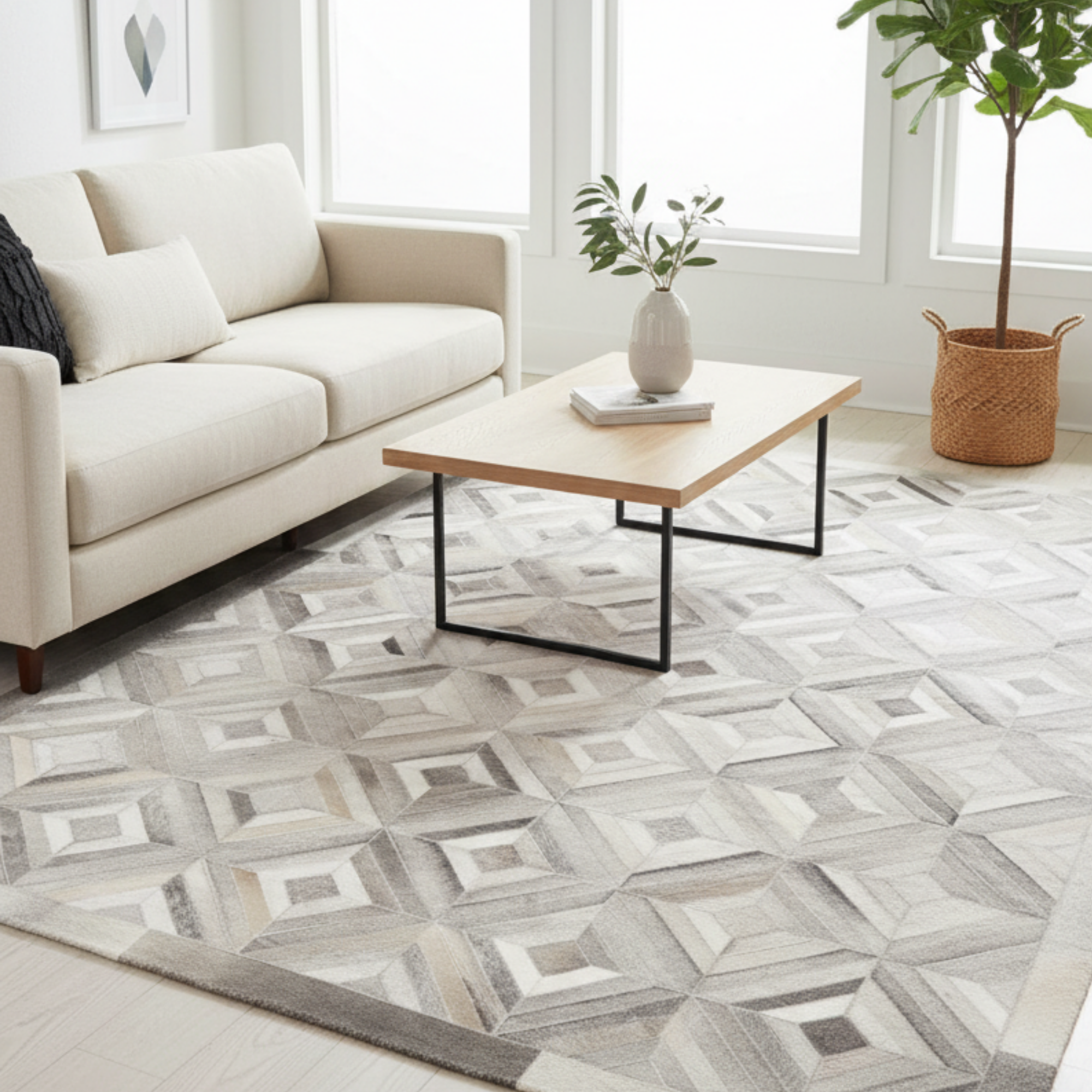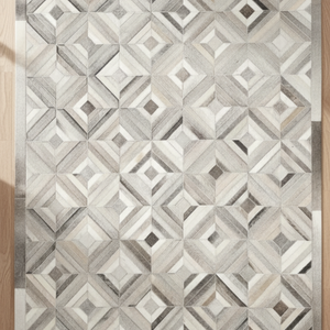 El işçiliğiyle bir araya getirilen geometrik parçalar, düzenli bir yapı sağlar ve halıya şık bir modern karakter kazandırır. Doğal deri yüzeyi dayanıklı, toz tutmayan ve kolay temizlenen formuyla uzun ömürlü kullanım imkânı sunar.