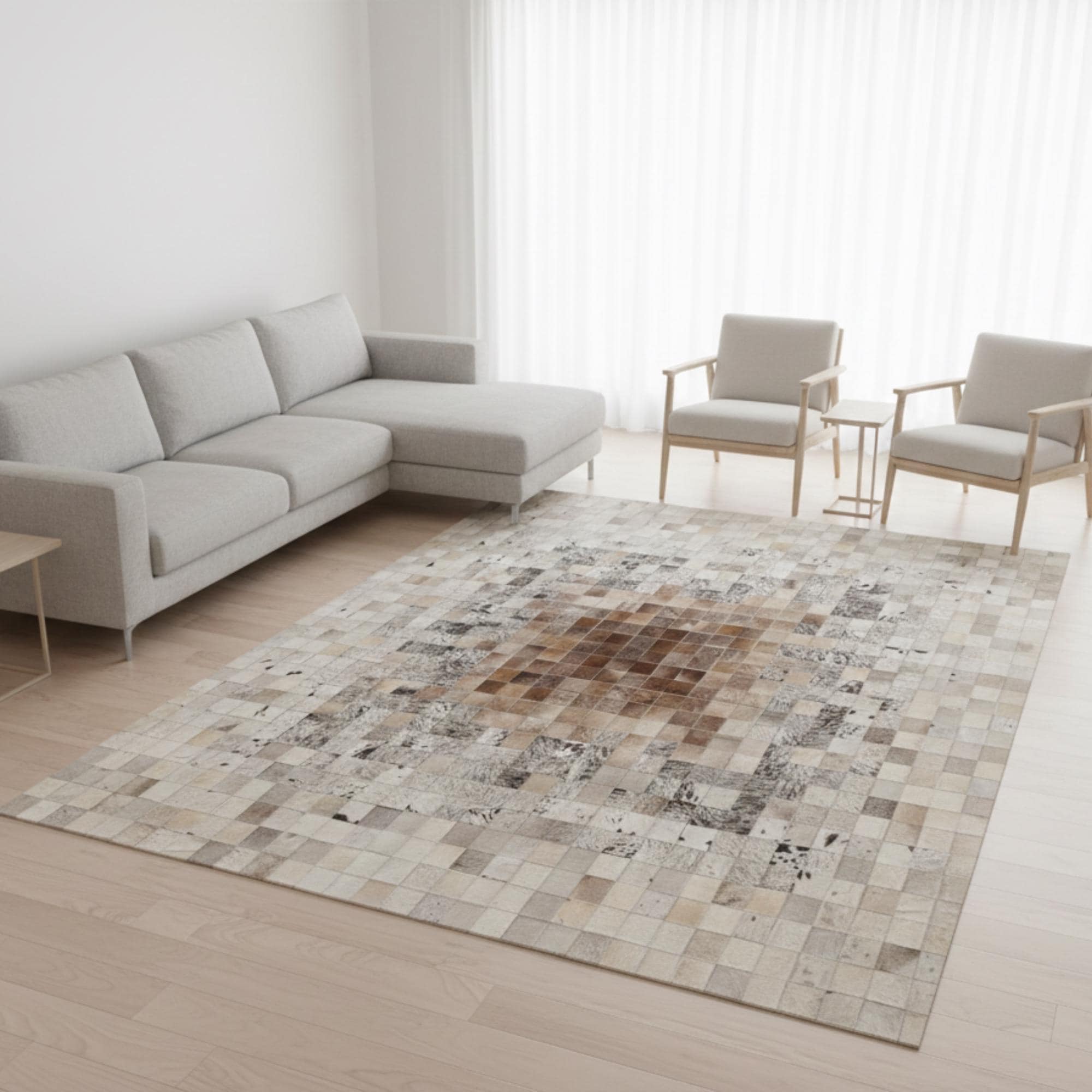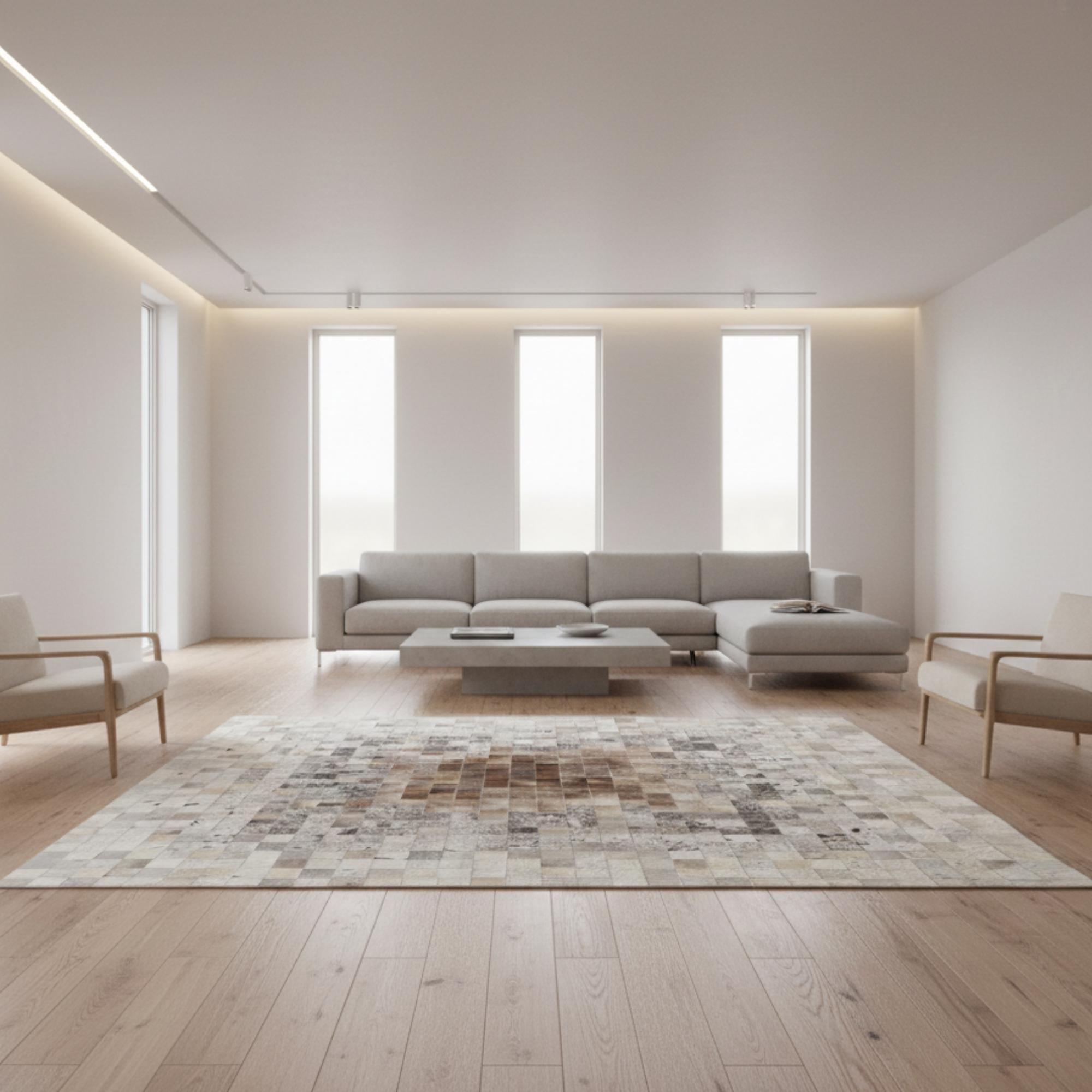 Merkezde açık bej ve krem tonların yumuşak geçişiyle başlayan, dışa doğru kahverengi ve doğal tonlarla derinlik kazanan dana derisi patchwork halı, dengeli ve ferah bir yüzey görünümü sunar. Gerçek dana derisinden üretilen bu halı, doğal dokusu ve sade renk geçişleriyle zamansız bir stil oluşturur.