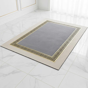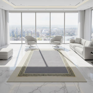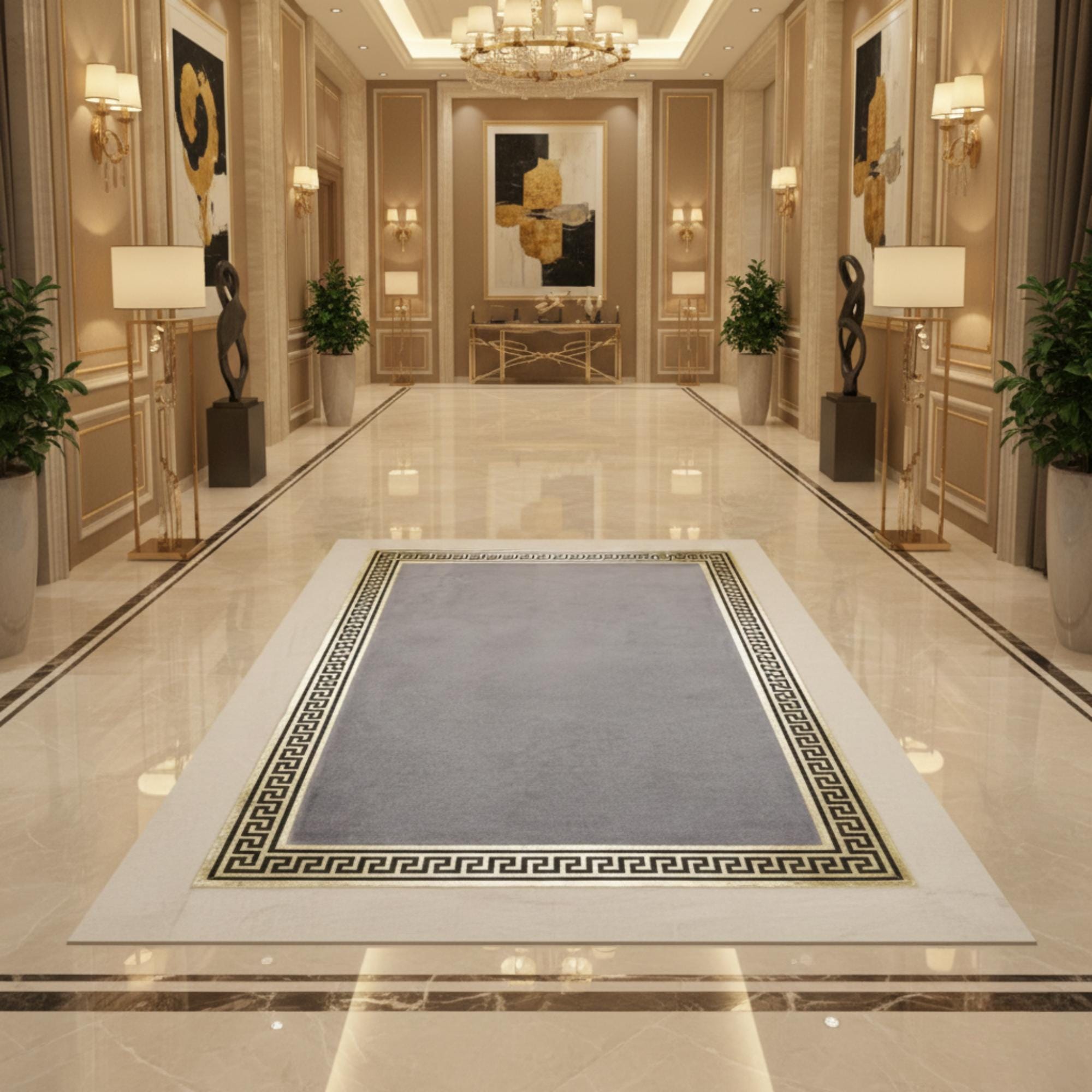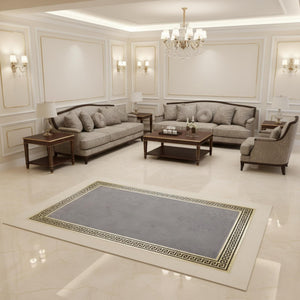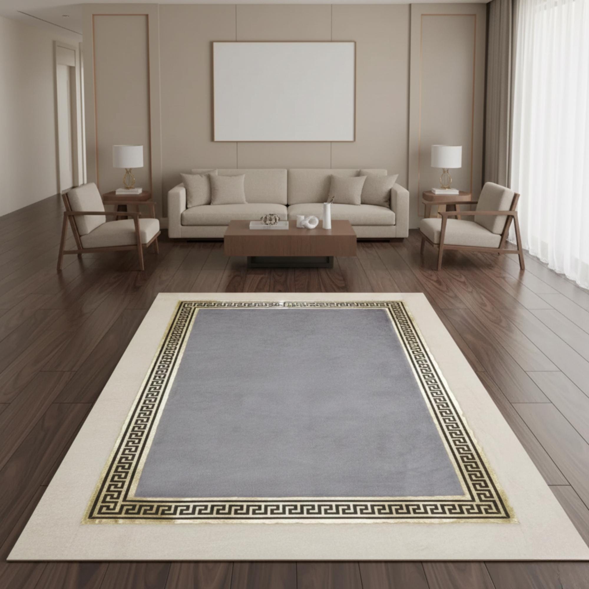 Gri Zeminli Altın Klasik Bordür Detaylı Peluş Halı – Yumuşak Dokulu, Şık ve Dekoratif Halı