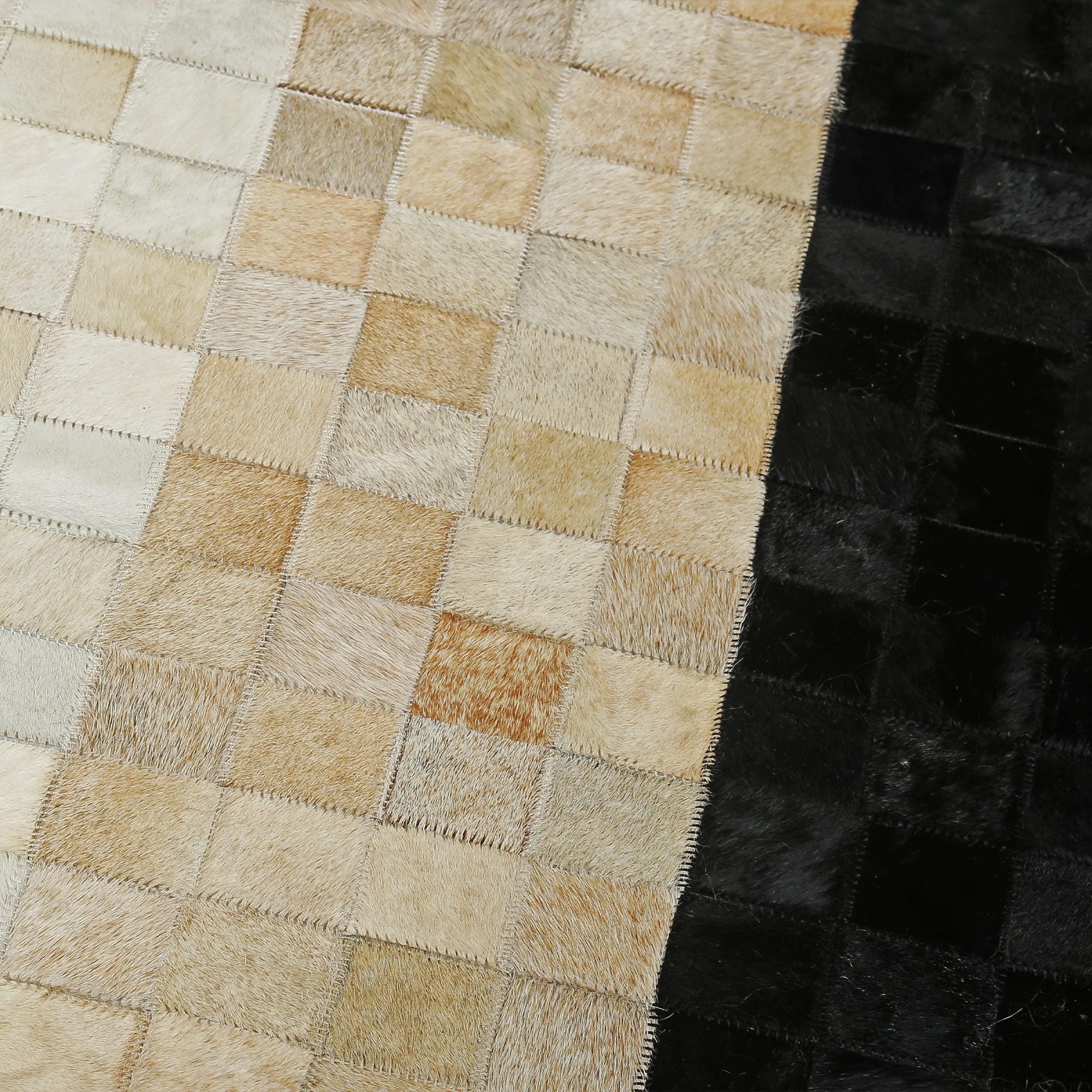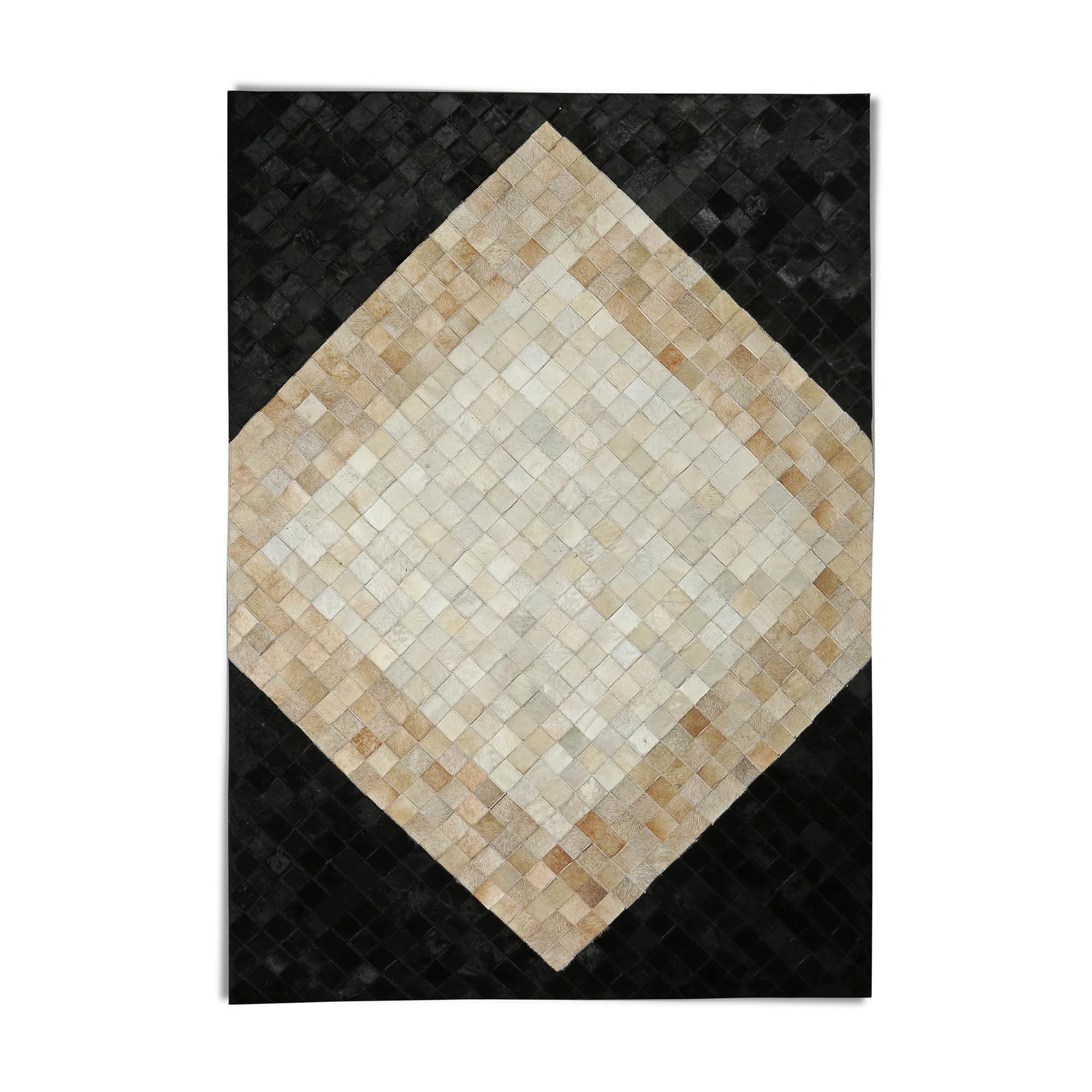 Siyah & bej & doğal tonlara sahip bu dana derisi halı, doğal dokusu ve şık görünümüyle dikkat çeker.
