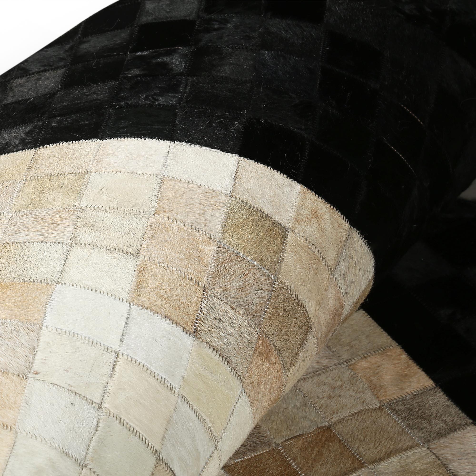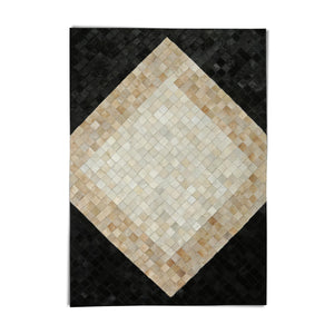 Baklava Desenli Bej Siyah Doğal Dana Derisi Patchwork Halı – El Yapımı Hakiki Deri Dekoratif Salon Halısı
