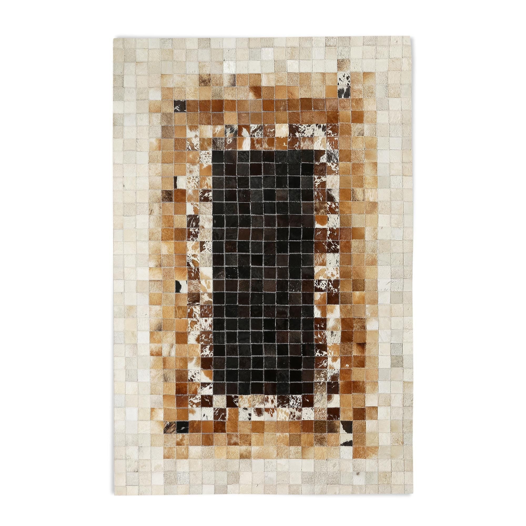 Kahverengi & bej & doğal tonlara sahip bu dana derisi halı, doğal dokusu ve şık görünümüyle dikkat çeker.