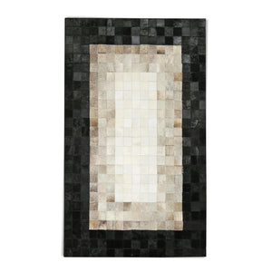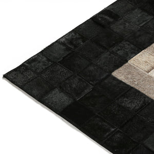 Siyah & bej tonlara sahip bu dana derisi halı, doğal dokusu ve şık görünümüyle dikkat çeker.