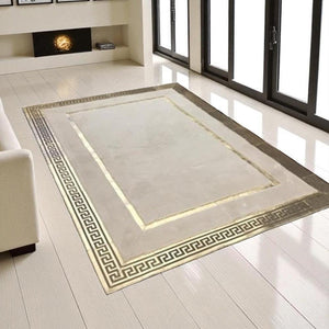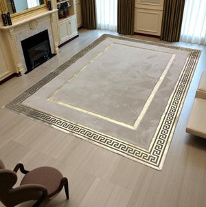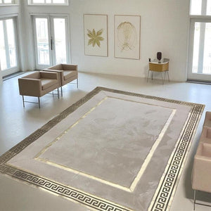 Altın Detaylı Bej Peluş Halı – El Yapımı Özel Ölçü Yatak Odası Halısı