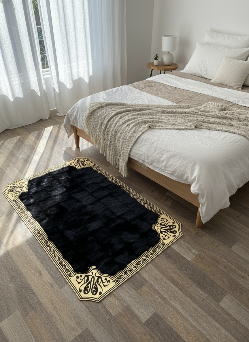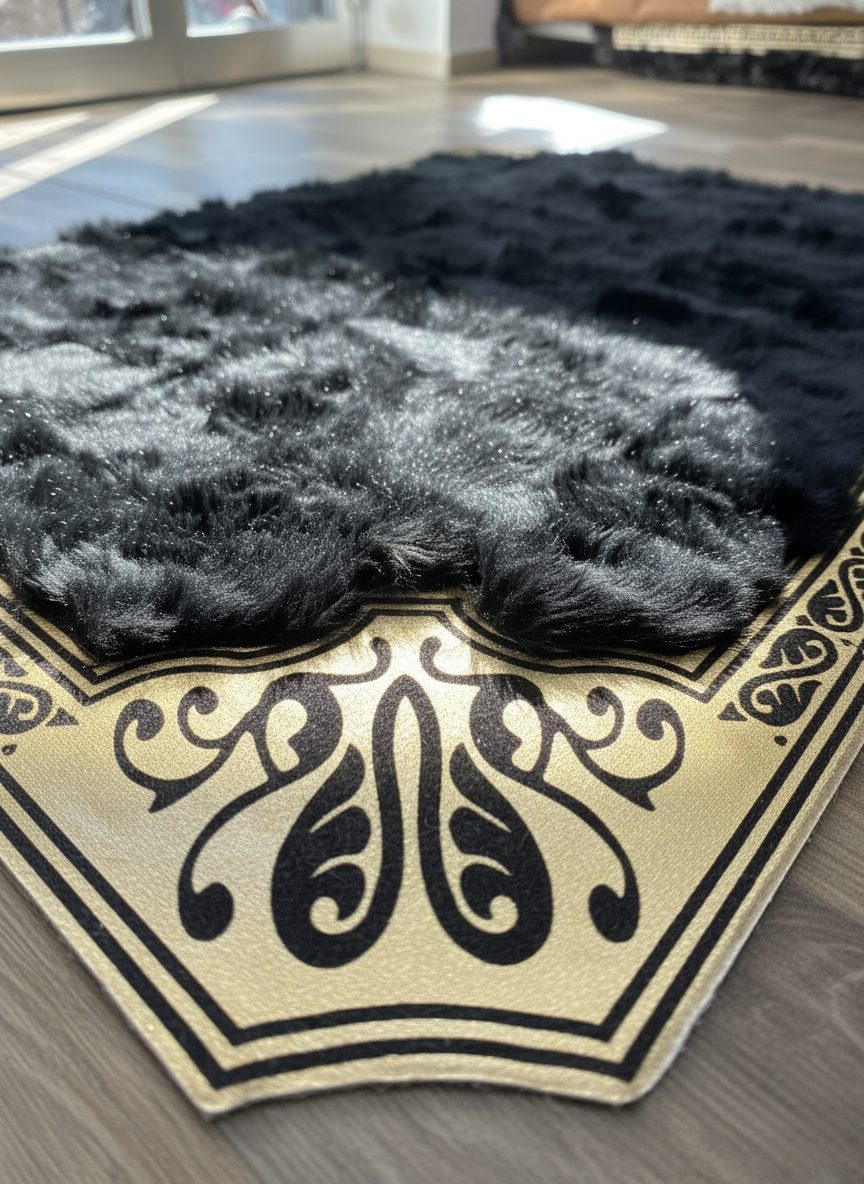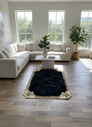 Siyah Toskana Halı – Altın Köşe Desenli, Yumuşak ve Doğal Kürk Doku, Kaymaz Taban – Özel Ölçü Seçenekleri