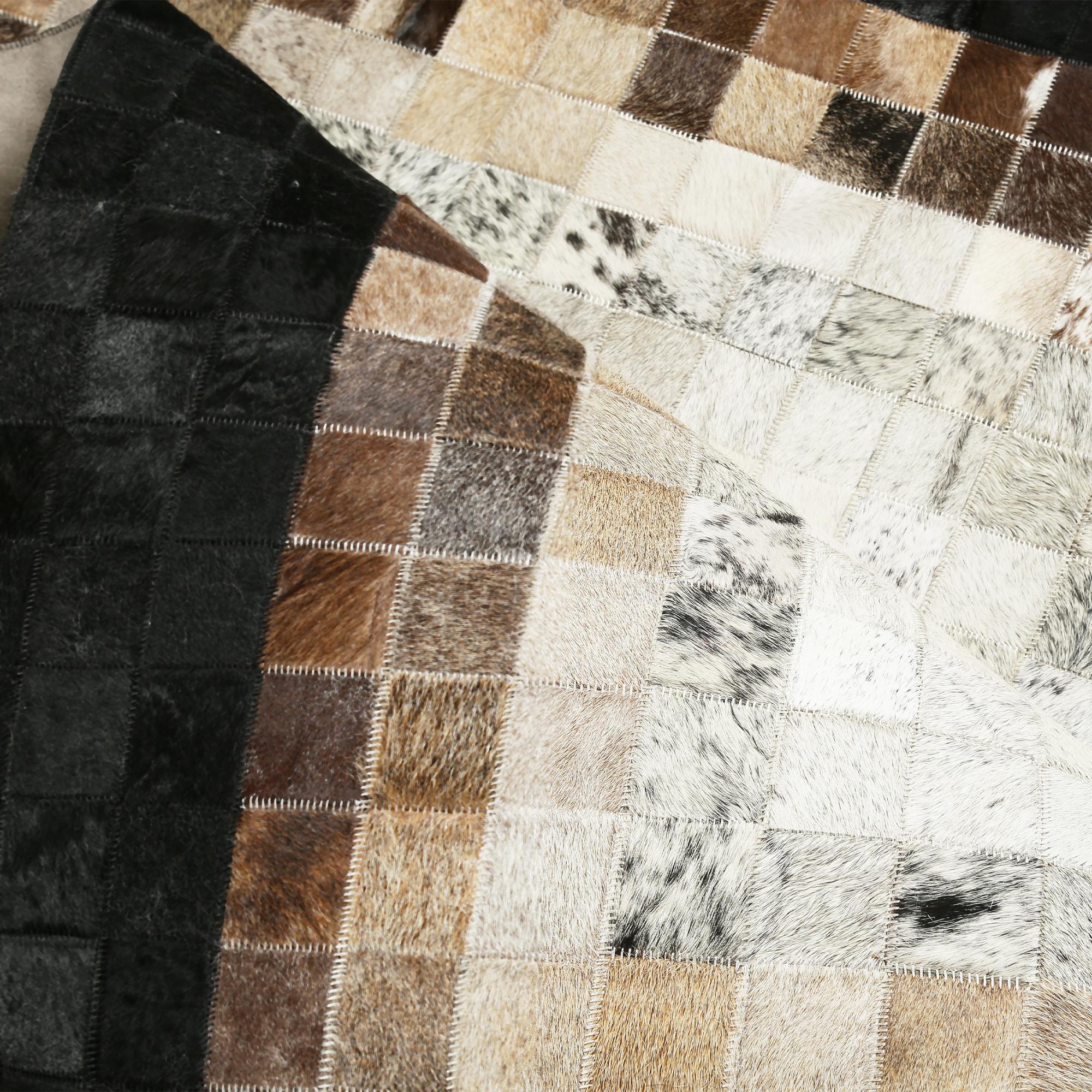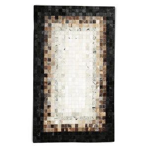 Siyah & bej & doğal tonlara sahip bu dana derisi halı, doğal dokusu ve şık görünümüyle dikkat çeker.