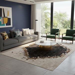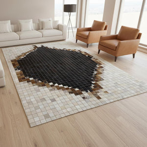 Koyu Siyah Merkezli Bej ve Kahverengi Tonlu Dana Derisi Patchwork Halı