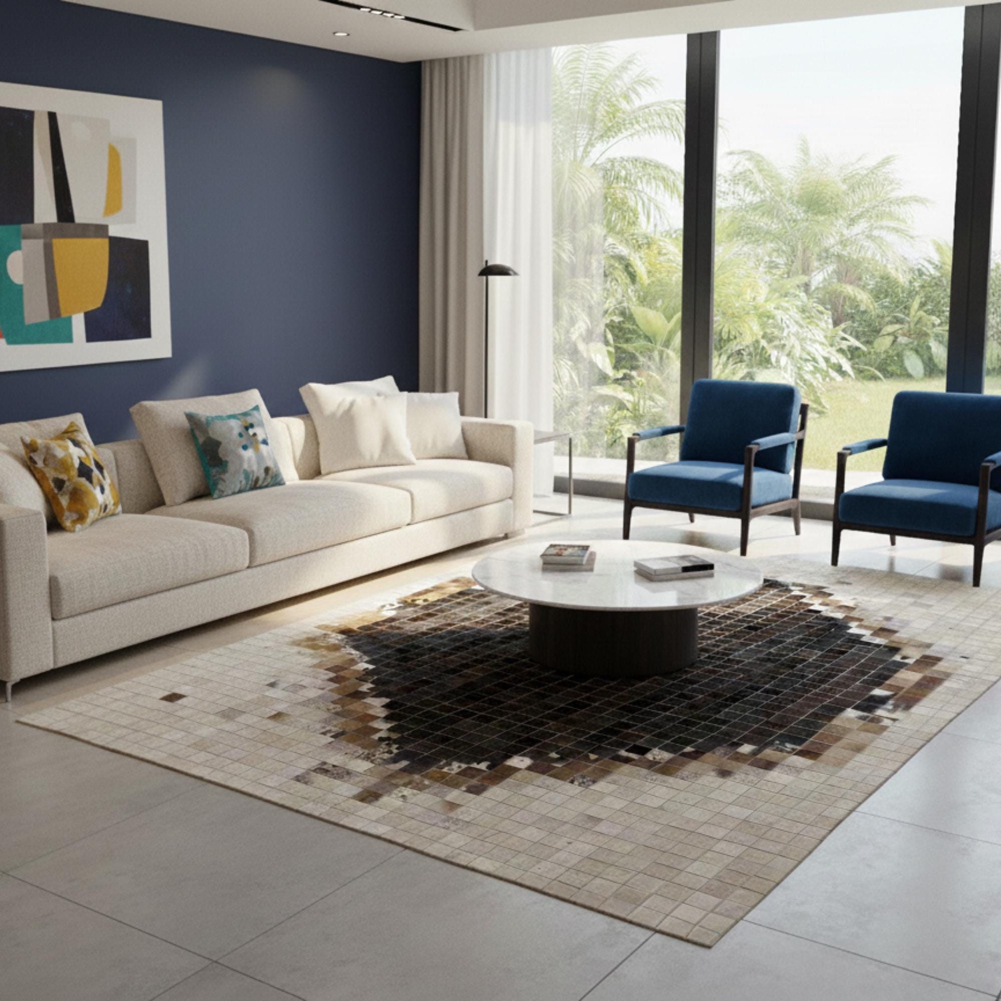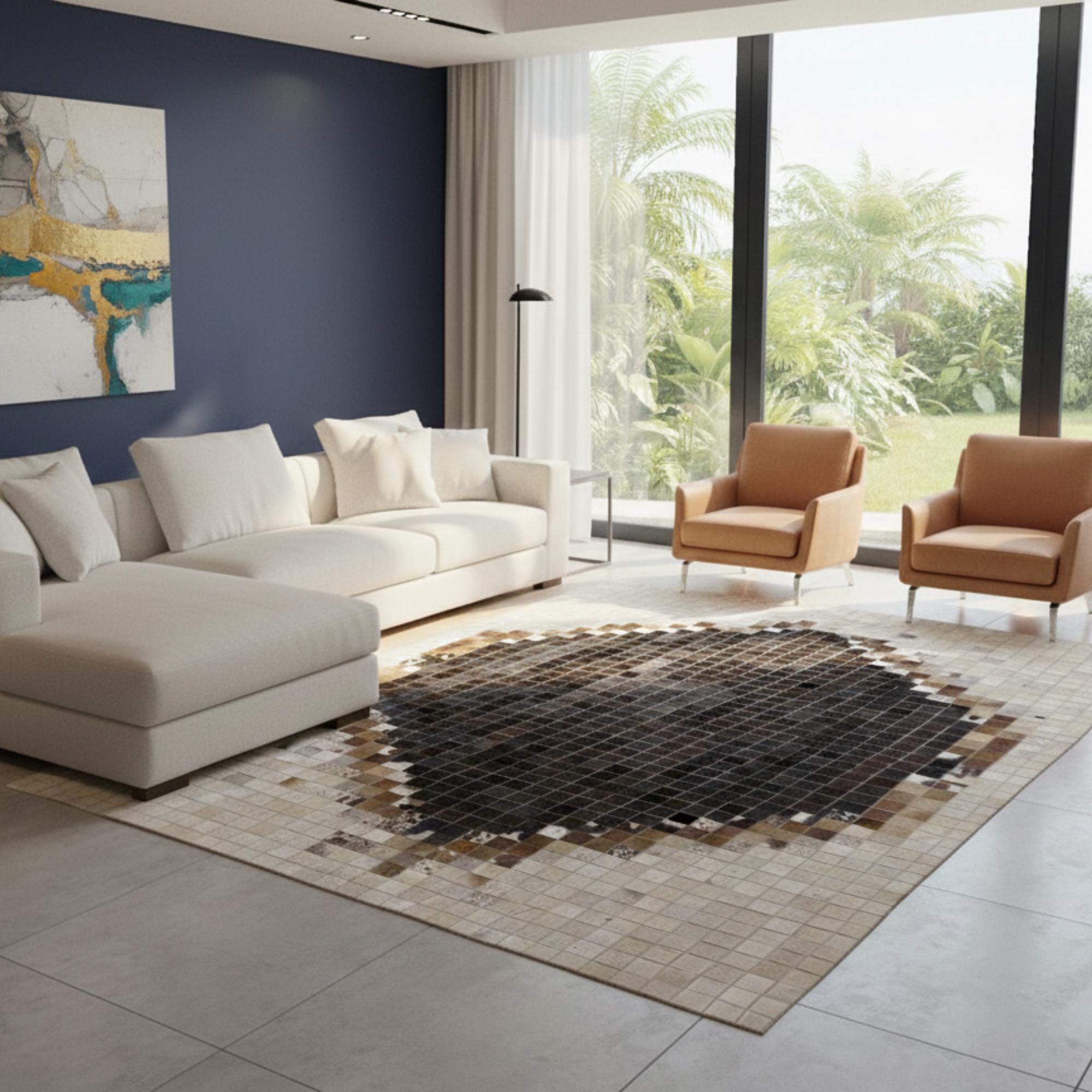 Koyu tonlu siyah merkez alanı ve çevresinde açık bej ile kahverengi geçişleri bulunan dana derisi patchwork halı, katmanlı görünümüyle güçlü ve dengeli bir zemin etkisi sunar. Gerçek dana derisinden üretilen bu halı, doğal renk dağılımı sayesinde mekâna derinlik ve karakter katar.