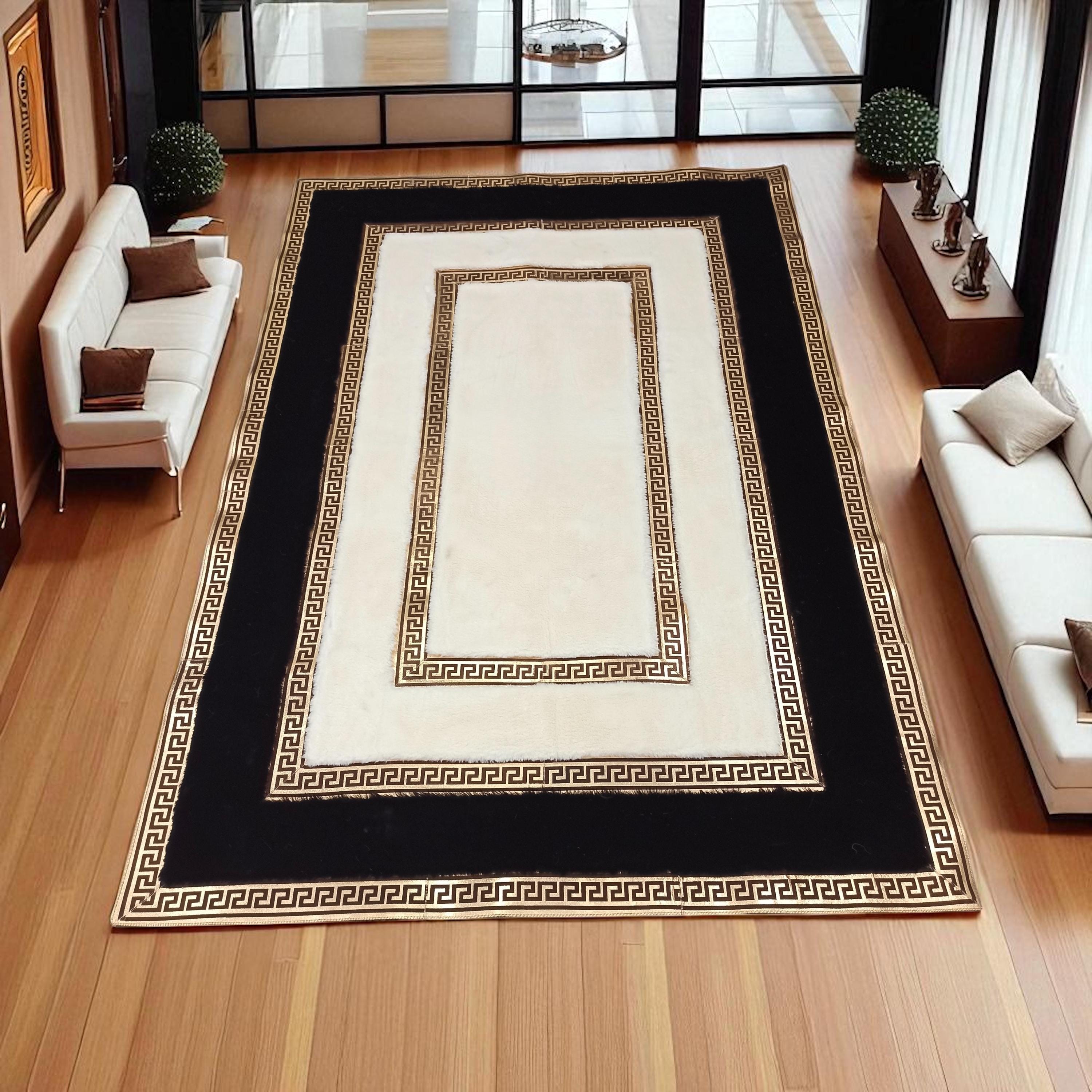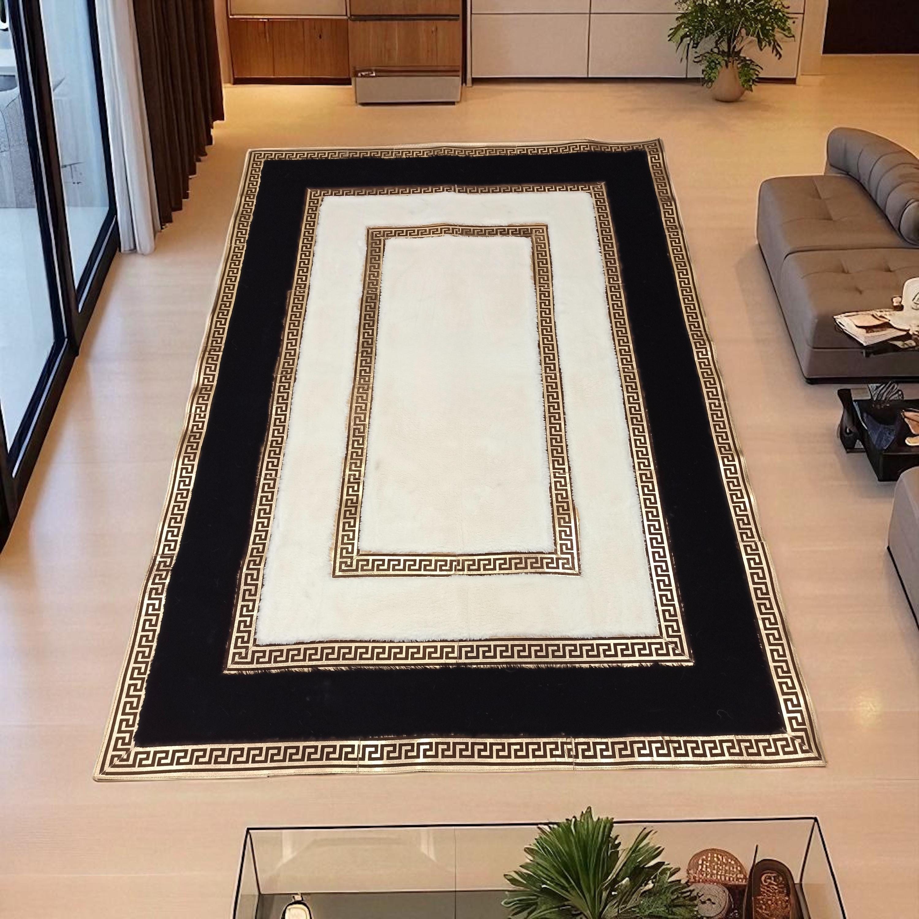 Siyah zemin altın bordürlü şekilde tasarlanan bu peluş halı, klasik ve asil bir hava sunar.