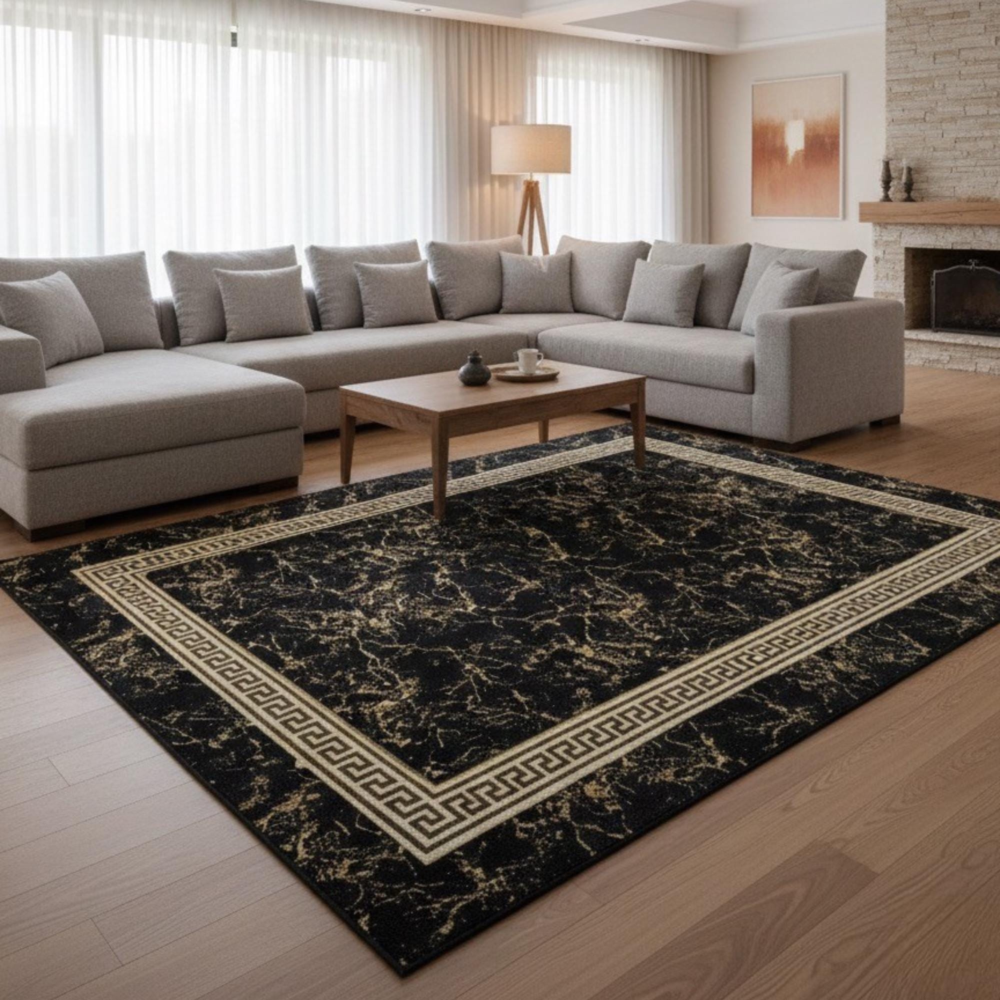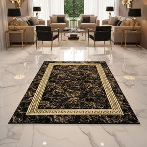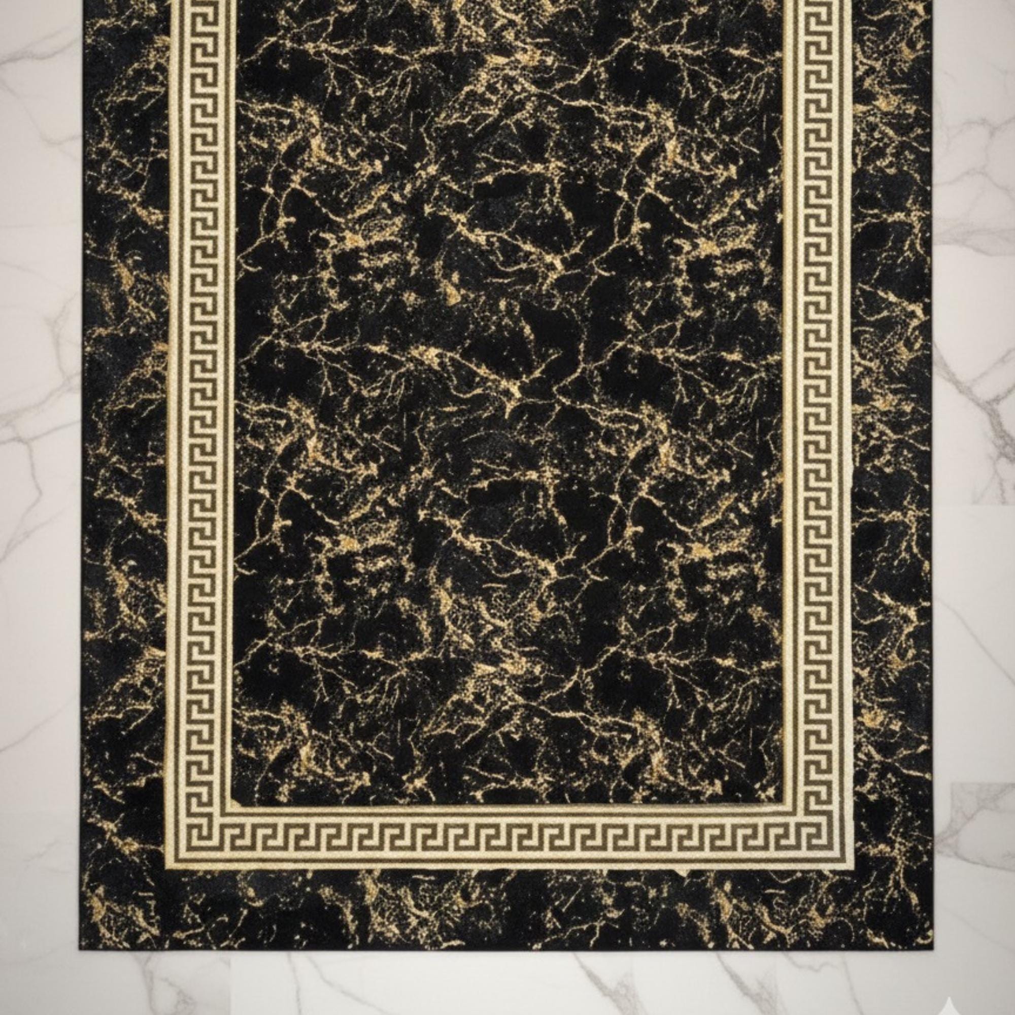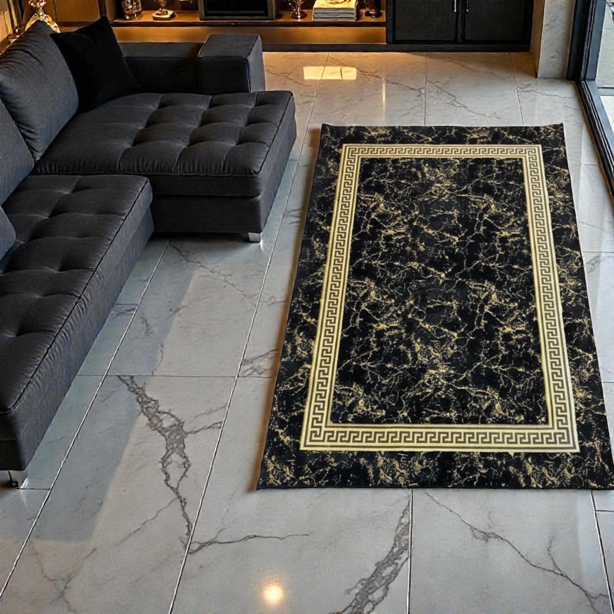 Siyah Zeminli Altın Desenli Çerçeveli Peluş Halı – Yumuşak Dokulu