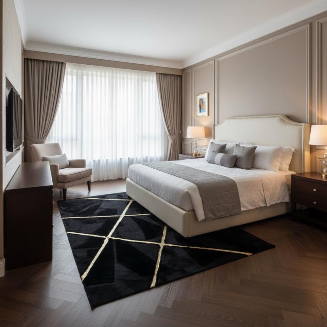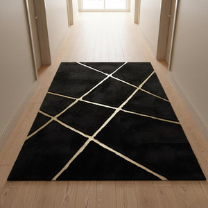 Siyah Zeminli Çapraz Altın Çizgi Detaylı Peluş Halı – Yumuşak Dokulu, Modern ve Dekoratif Halı