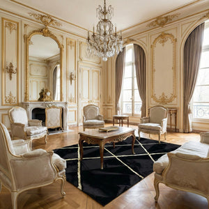 Siyah zemin üzerine çapraz şekilde ilerleyen altın çizgi detaylarıyla tasarlanan bu peluş halı, dinamik desen yapısı ve güçlü kontrastıyla mekâna modern ve dikkat çekici bir görünüm kazandırır. Çapraz çizgiler halıya hareket katarken, koyu zemin tasarımı dengeler ve net bir odak noktası oluşturur.
