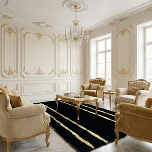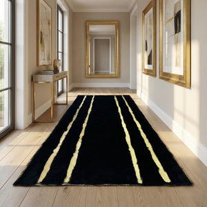 Siyah zemin üzerine uzanan altın şerit detaylarıyla tasarlanan bu peluş runner halı, lineer deseni sayesinde mekânda derinlik ve akış hissi oluşturur. Uzun formu vurgulayan altın çizgiler, halının merkezini belirginleştirirken sade zeminle dengeli ve şık bir görünüm sunar.