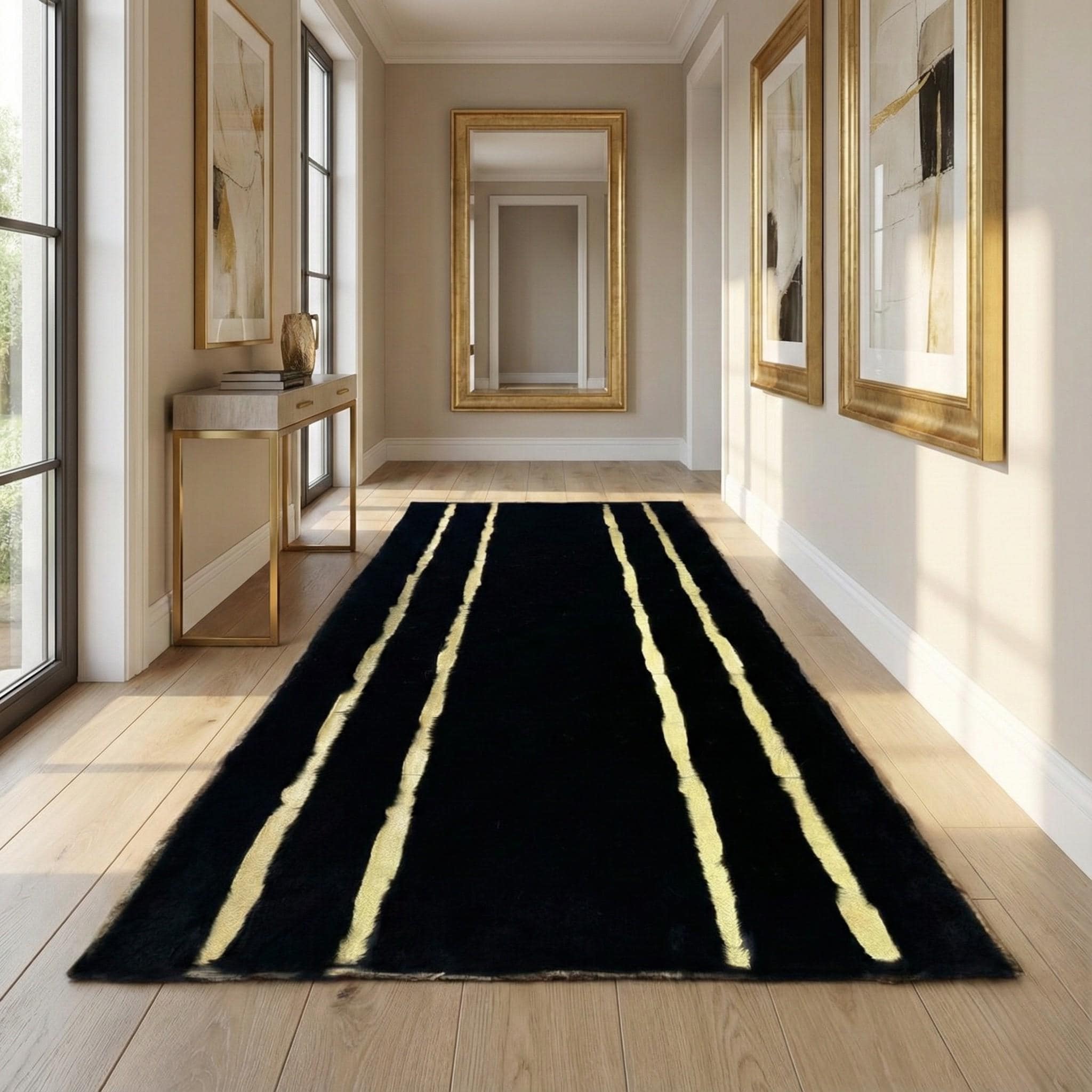 Siyah Zeminli Altın Şerit Detaylı Peluş Runner Halı – Yumuşak Dokulu, Modern ve Dekoratif Halı