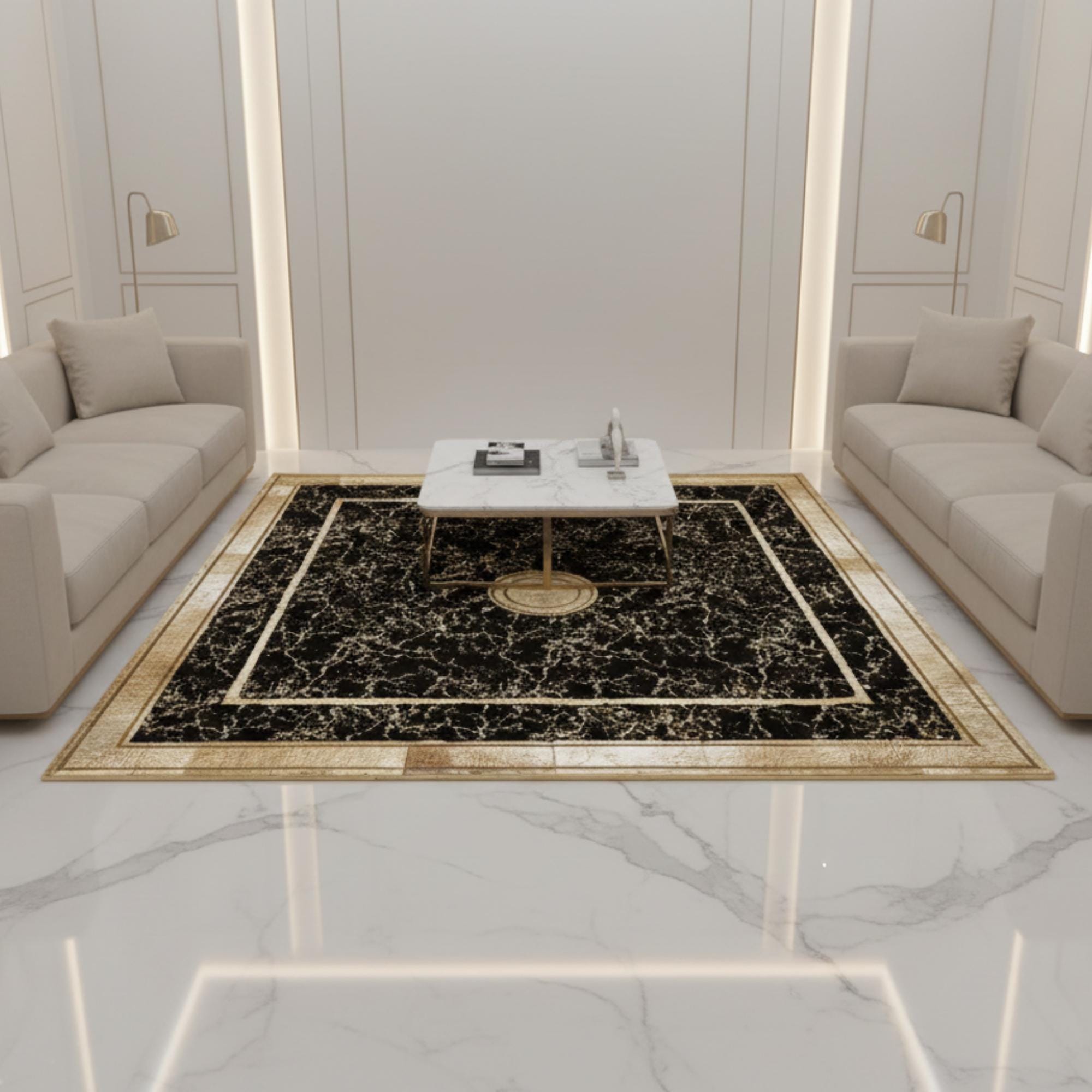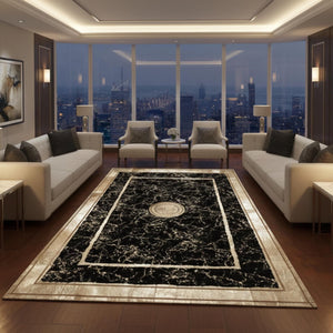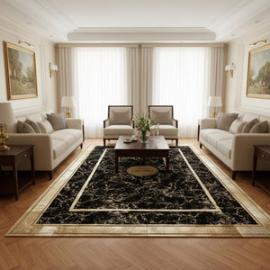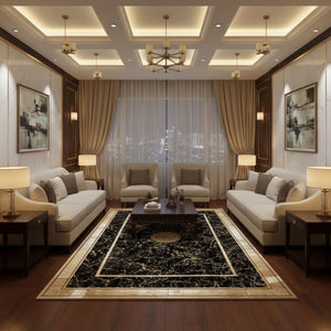 Siyah Zeminli Klasik Desenli Altın Çerçeveli Peluş Halı – Yumuşak Dokulu, Şık ve Dekoratif Halı