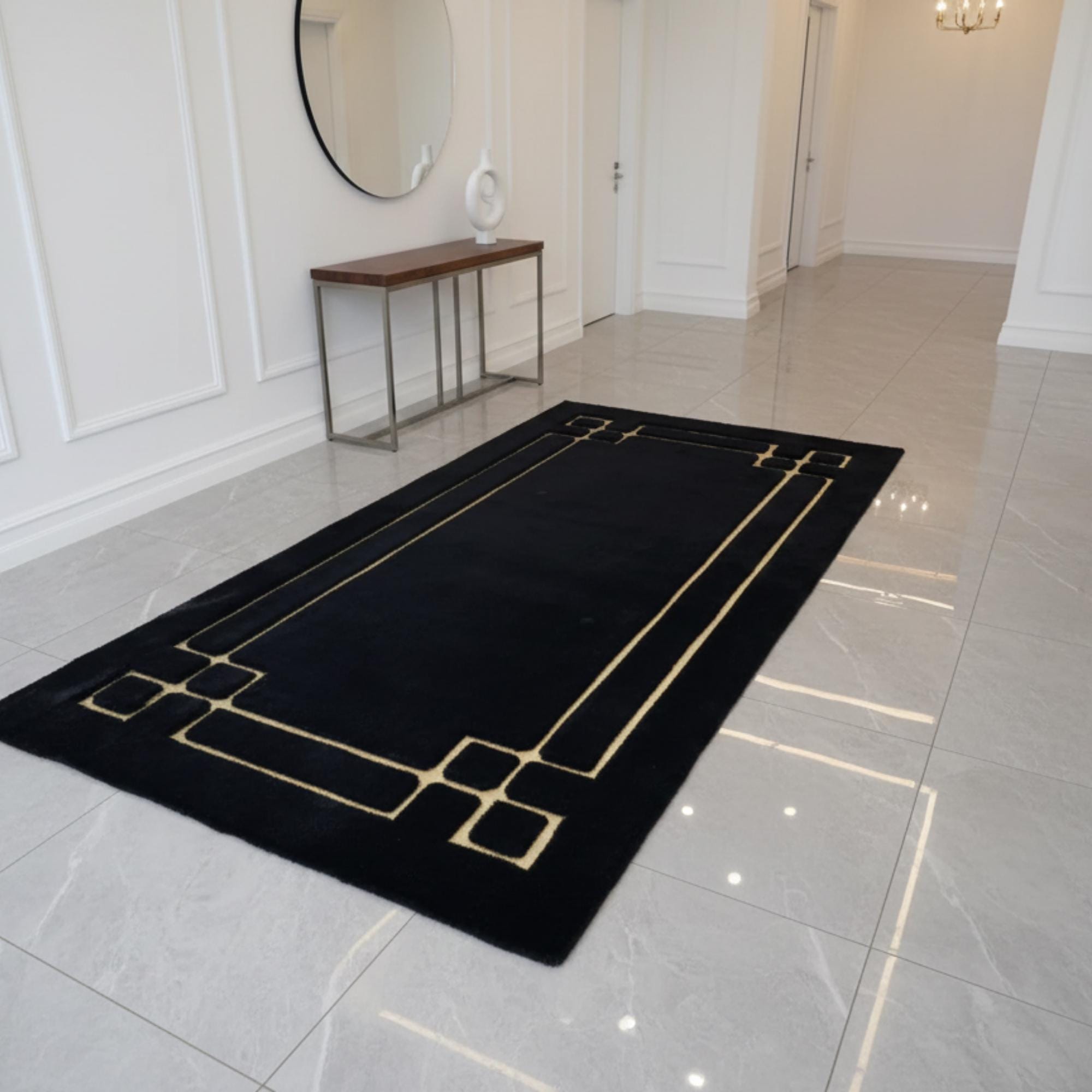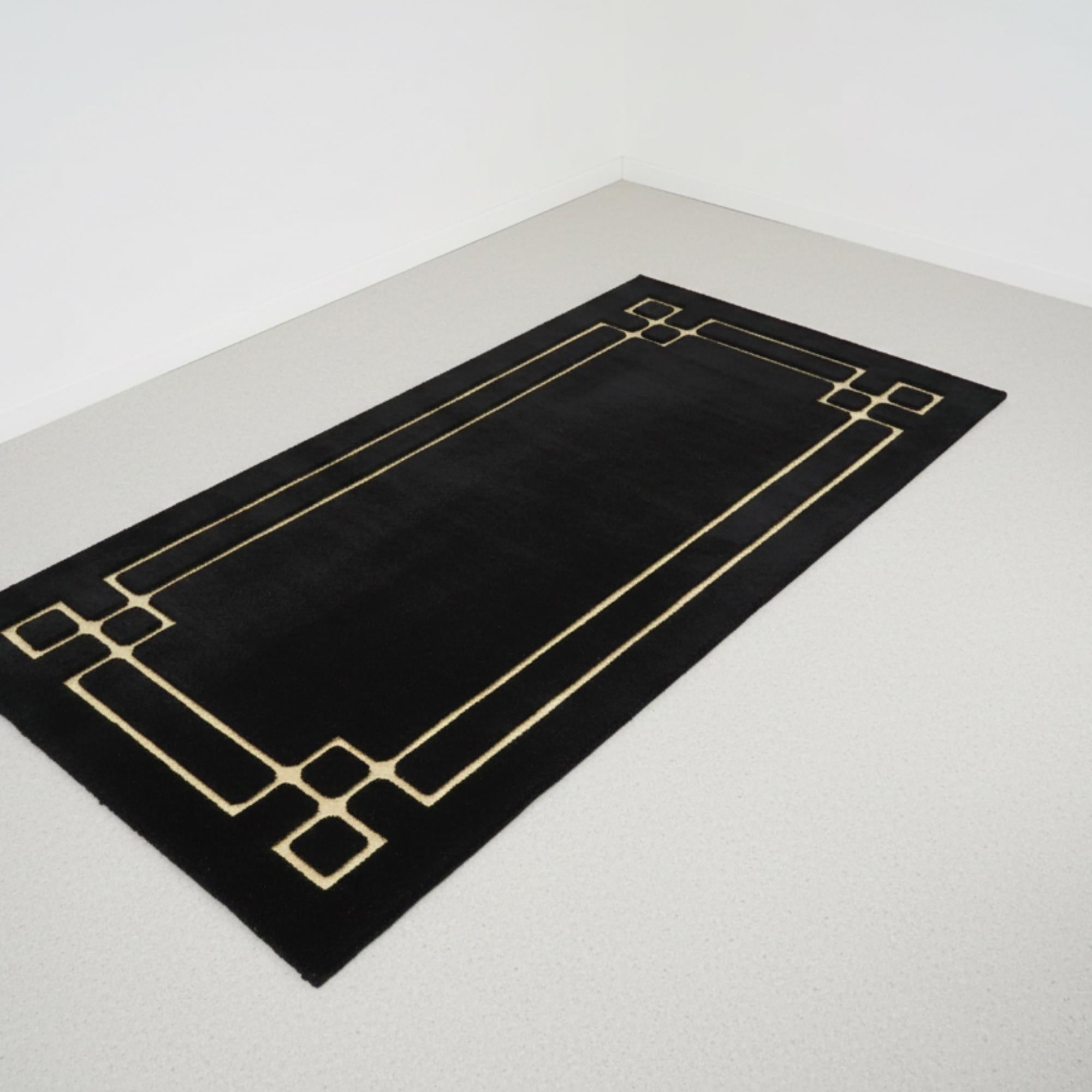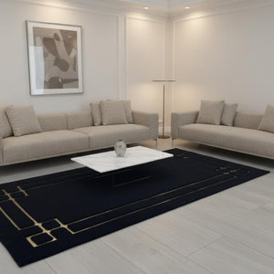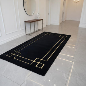 Siyah zemin üzerine altın geometrik çizgi detaylarıyla tasarlanan bu peluş runner halı, uzun formu boyunca net hatlar ve dengeli bir kompozisyon sunar. Kenarlarda ve köşelerde devam eden gold çizgiler halının sınırlarını belirginleştirirken, koyu zemin modern ve güçlü bir görünüm kazandırır.