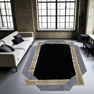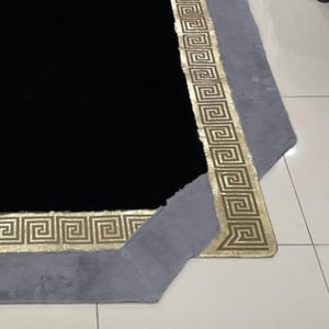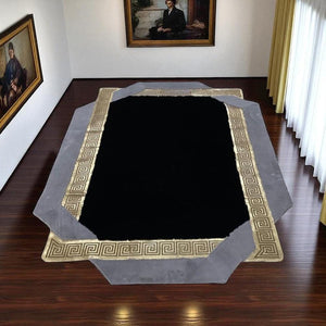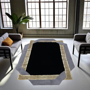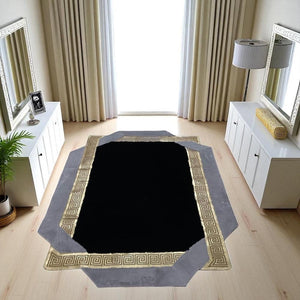 Gri ve Altın Bordürlü Siyah Peluş Halı - Şık Yumuşak Salon Halısı