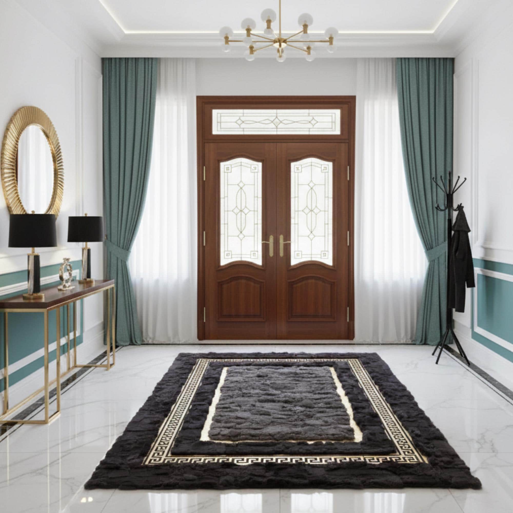 Doğal rex tavşan kürkünden üretilen bu salon halısı, Antrasit Gri , koyu gri tonların güçlü duruşunu altın geometrik bordür detayıyla birleştirerek yaşam alanlarına modern ve lüks bir karakter kazandırır. Rex tavşan kürküne özgü kadifemsi yumuşaklık, halıya son derece konforlu ve rafine bir his verirken koyu renk paleti mekânda derinlik ve sofistike bir atmosfer oluşturur. Altın bordür, halının formunu net bir şekilde vurgulayarak modern ve seçkin bir estetik sunar.
