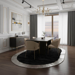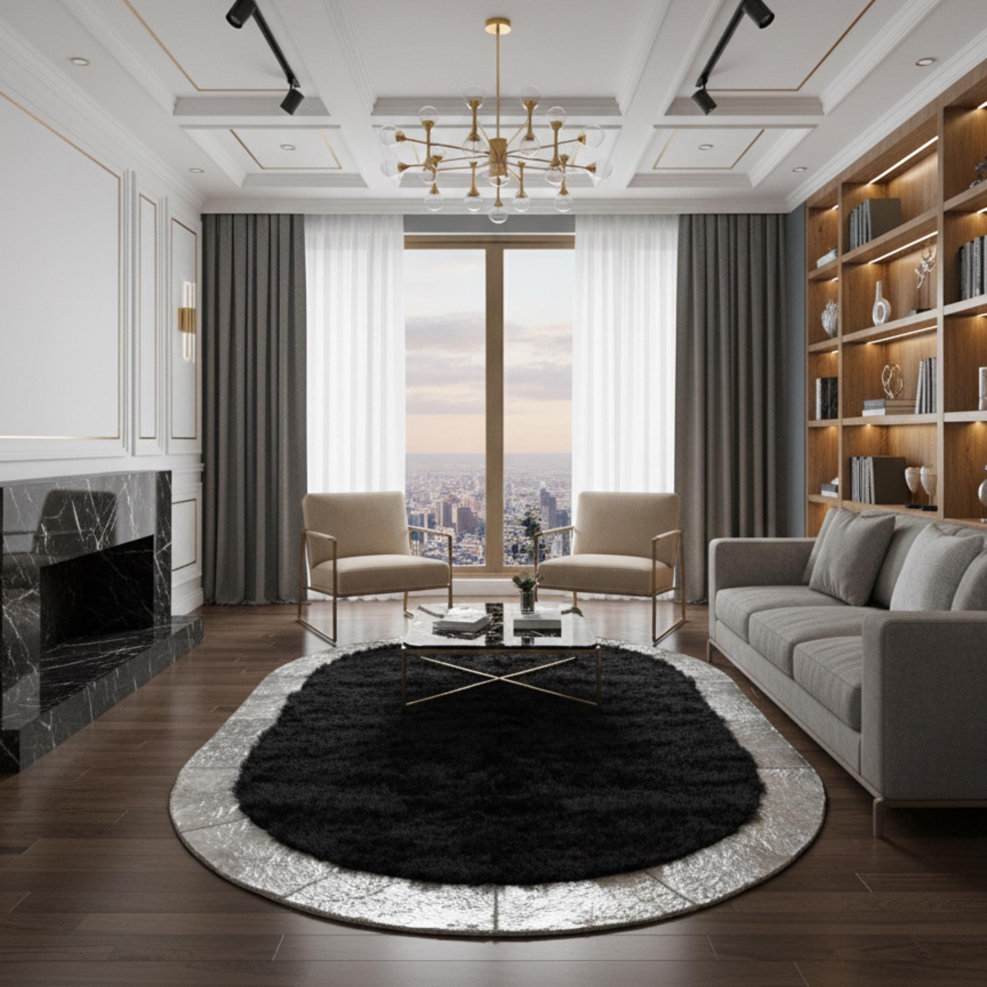Doğal Toscana kürkünden üretilen bu oval halı, siyah zemin rengi ve açık tonlu zarif çerçevesiyle giriş alanlarına güçlü ve sofistike bir karakter kazandırır. Oval formu sayesinde mekânda yumuşak bir akış hissi oluştururken siyah rengin asaleti dekorasyona derinlik ve prestij katar. Toscana kürkünün yumuşak ve ipeksi dokusu, halıya hem görsel zenginlik hem de konforlu bir kullanım hissi kazandırarak merdiven önü ve antre alanlarında etkileyici bir odak noktası oluşturur.