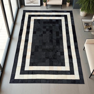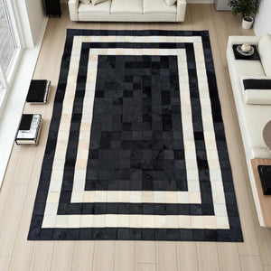 Beyaz Çerçeveli Siyah Dana Derisi Halı – El Yapımı Şık Patchwork Salon Halısı
