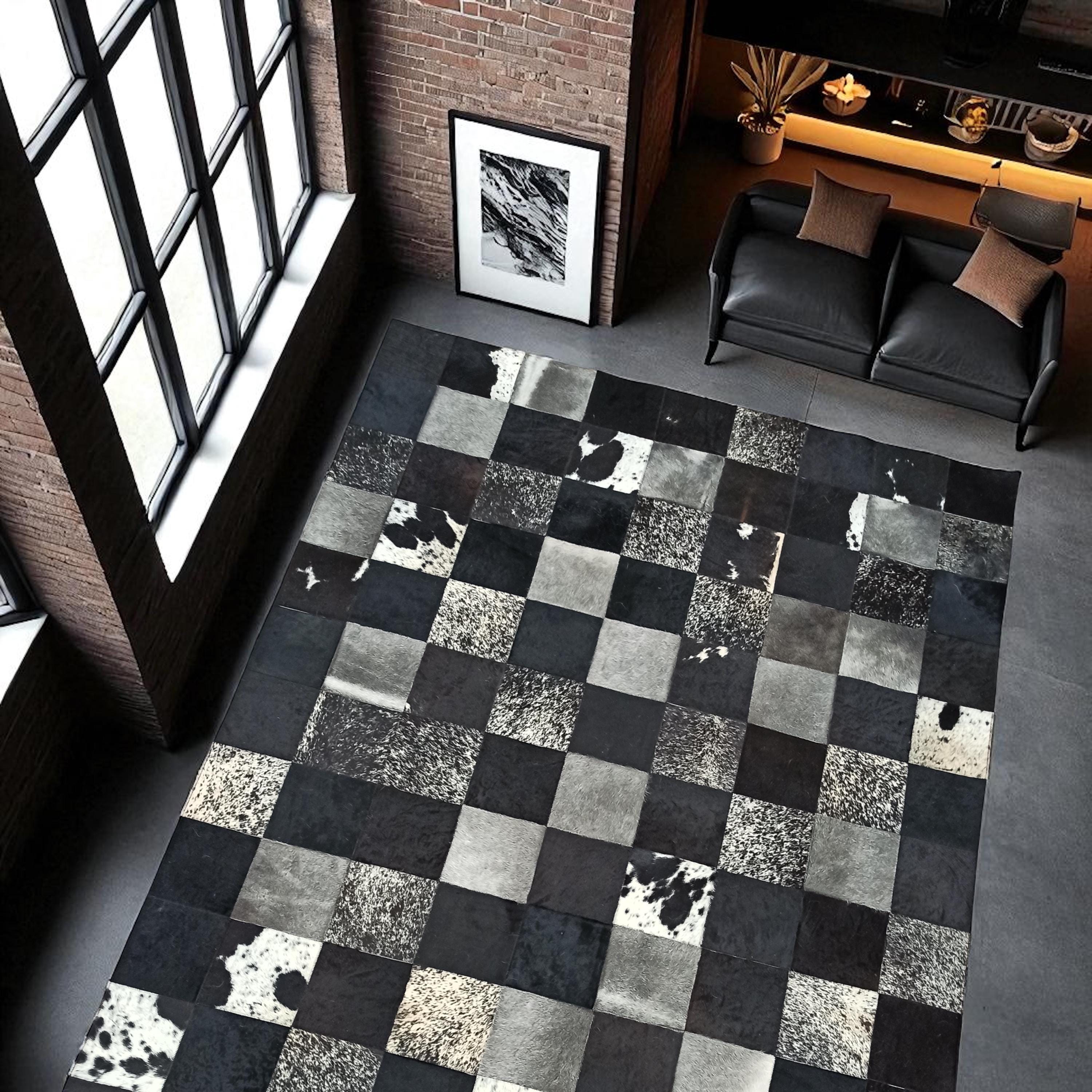 El Yapımı Siyah Beyaz Patchwork Halı – Doğal Dana Derisi Şık Yatak Odası Halısı