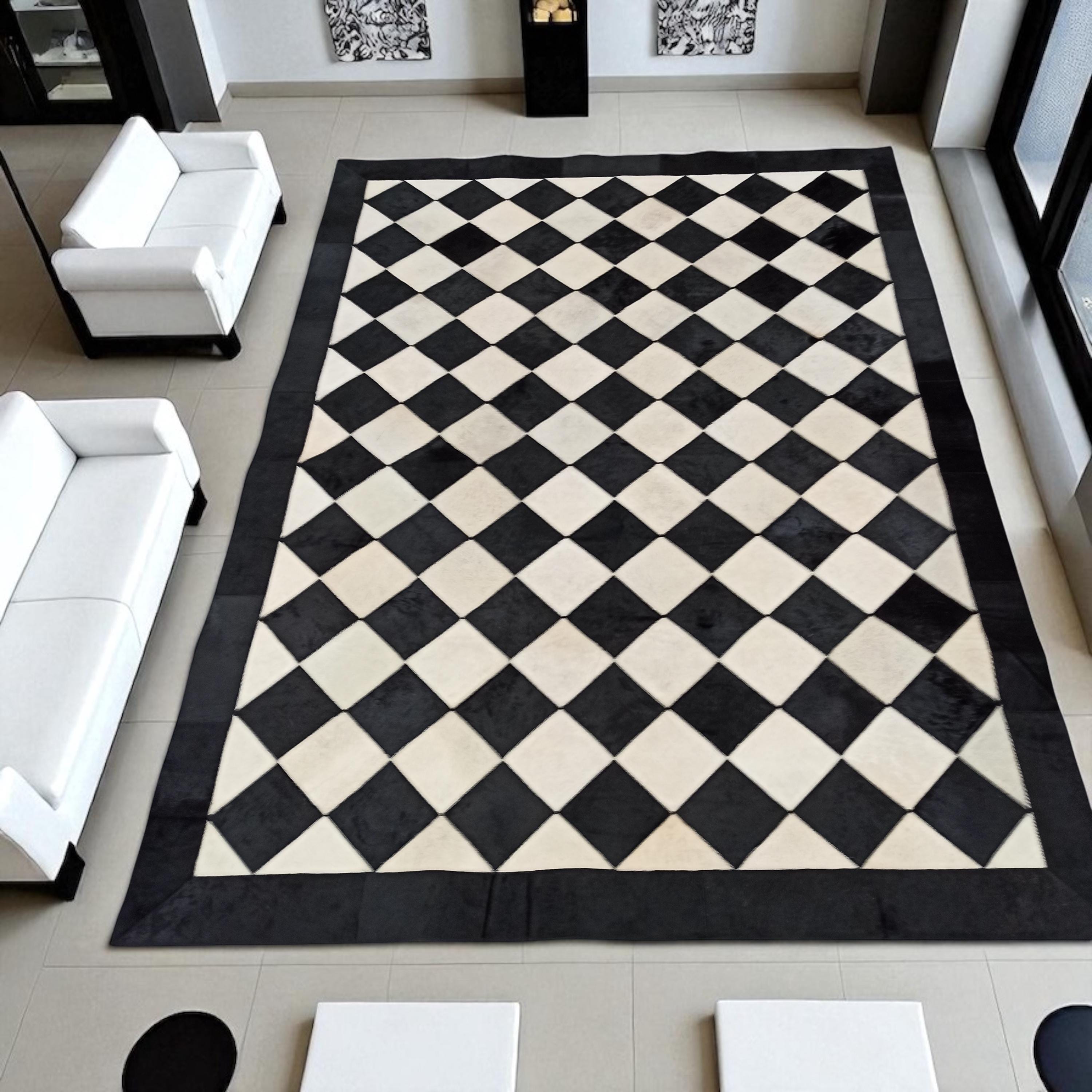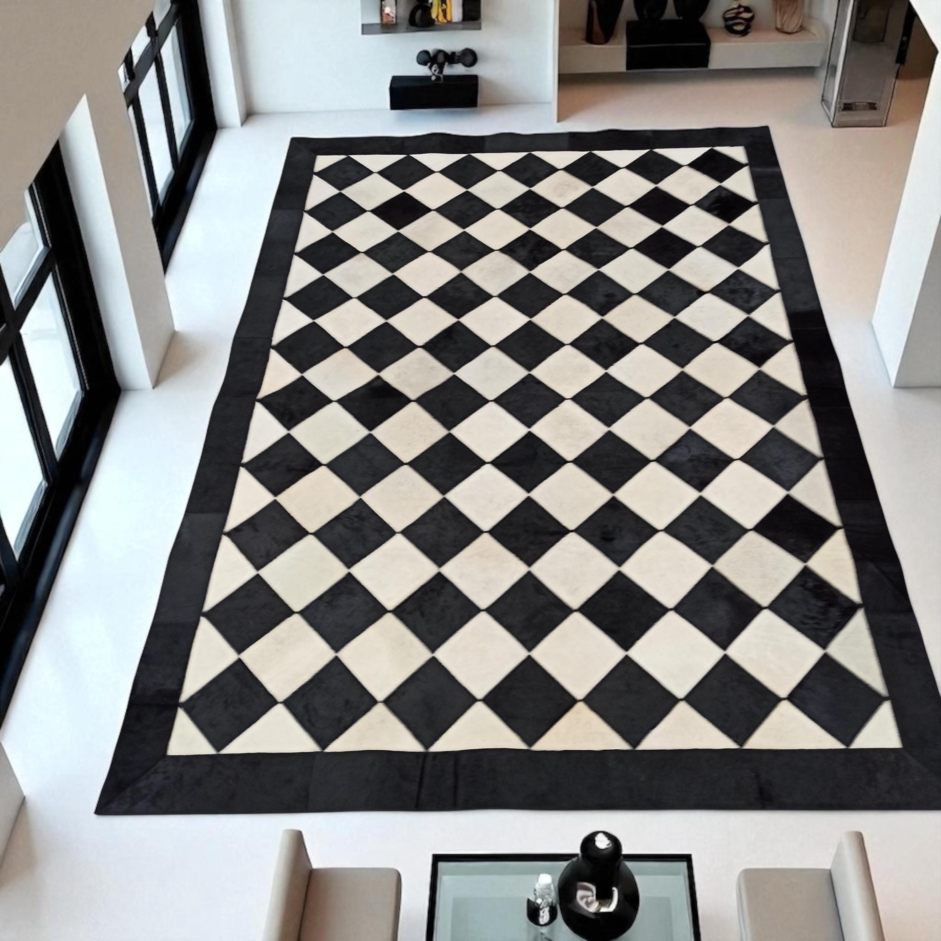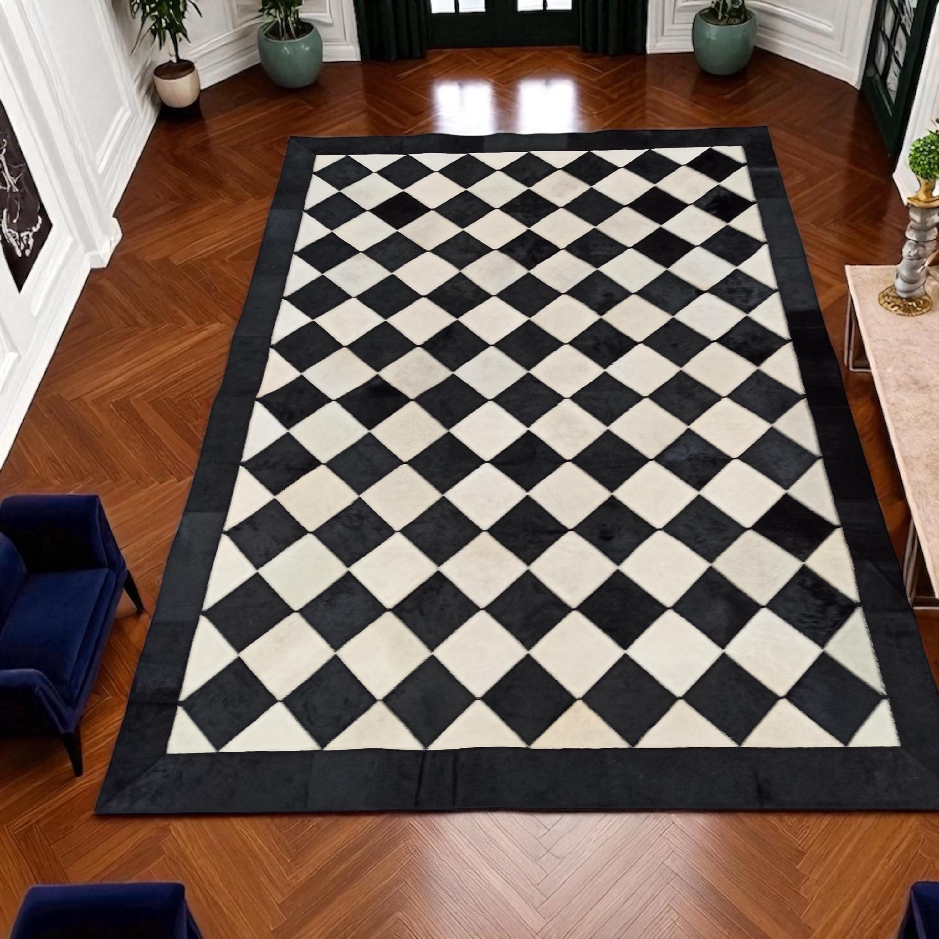 Siyah Beyaz Baklava Desenli Dana Derisi Patchwork Halı – El Yapımı Modern Salon Halısı