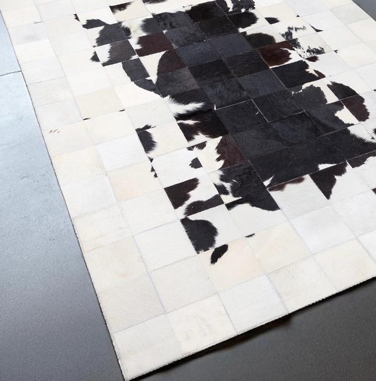Siyah & beyaz tonlara sahip bu dana derisi halı, doğal dokusu ve şık görünümüyle dikkat çeker.