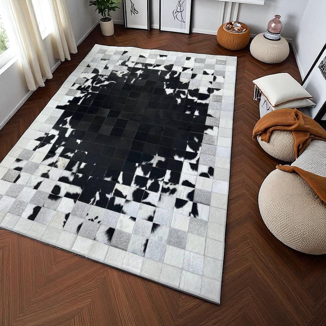 Siyah Beyaz Doğal Dana Derisi Patchwork Halı – El Dokuma Hakiki Deri Kaymaz Şık Salon Halısı