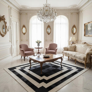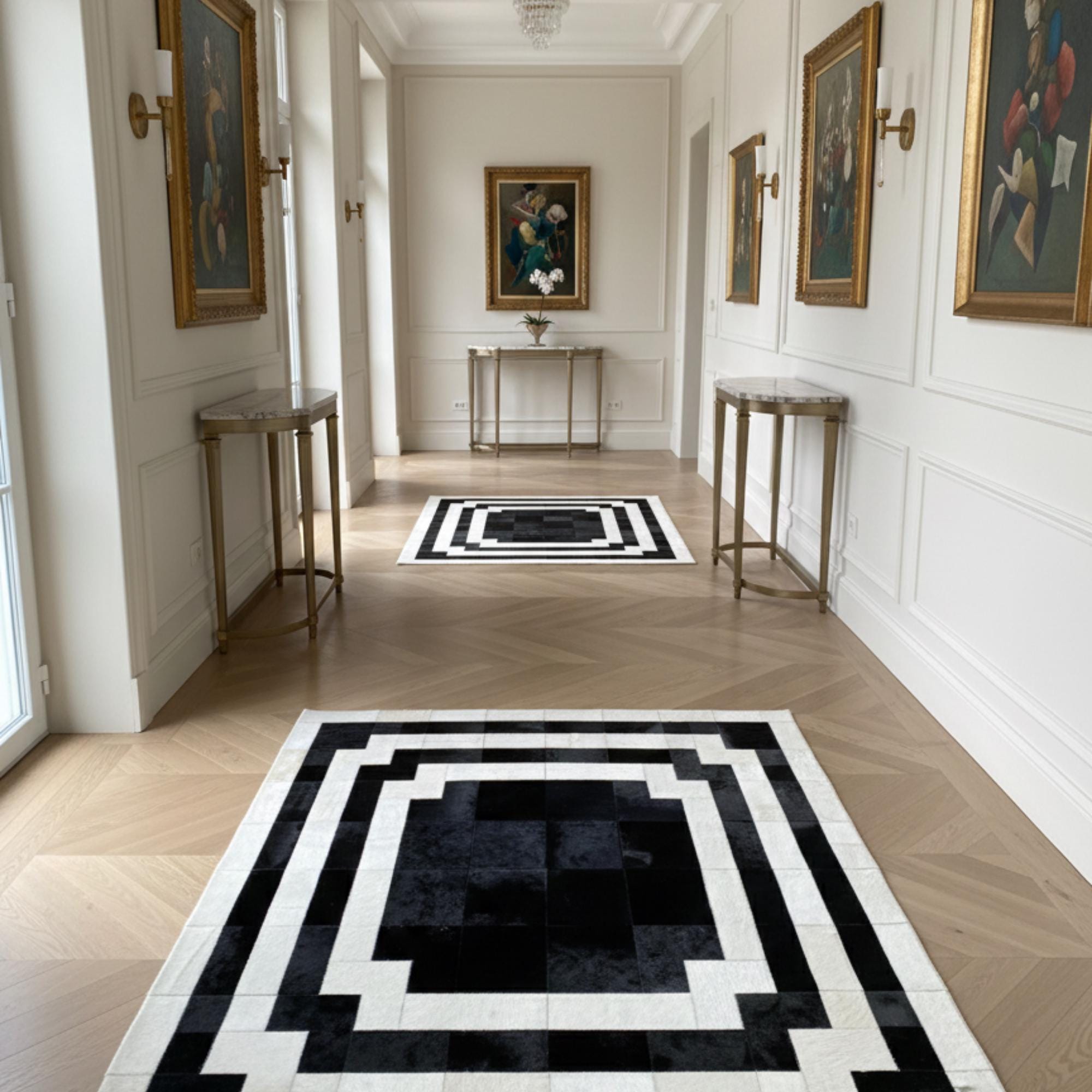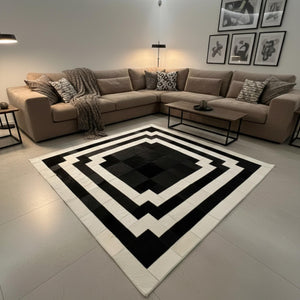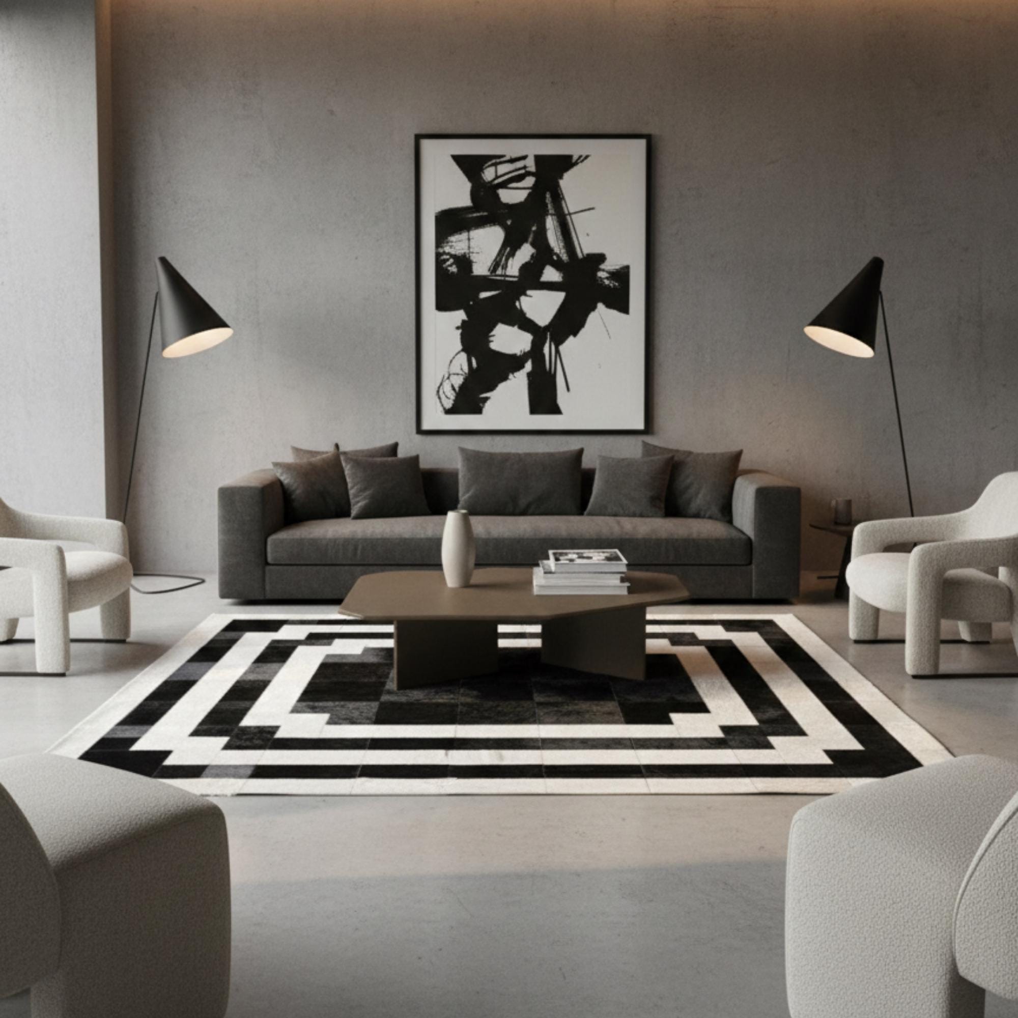 Siyah zemin üzerine beyaz çok katmanlı geometrik bordürlerle tasarlanan dana derisi patchwork halı, net çizgileri ve güçlü kontrastıyla modern bir görünüm sunar. Gerçek dana derisinden üretilen bu halı, doğal dokusu ve düzenli yüzeyiyle öne çıkar.