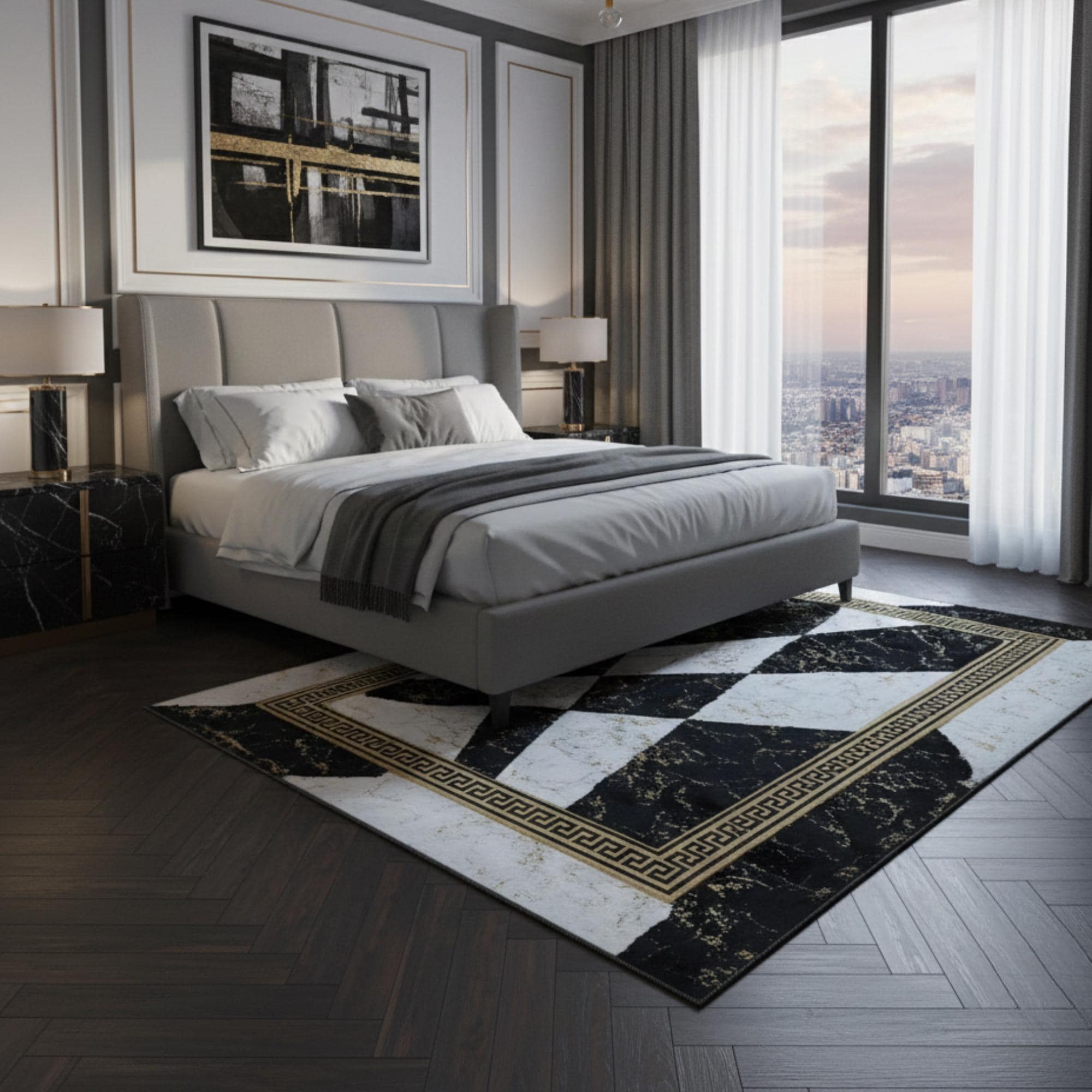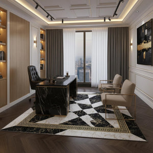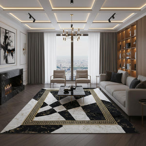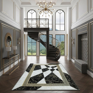 Siyah ve Beyaz Zeminli Desenli Altın Çerçeveli Peluş Halı
