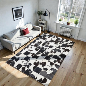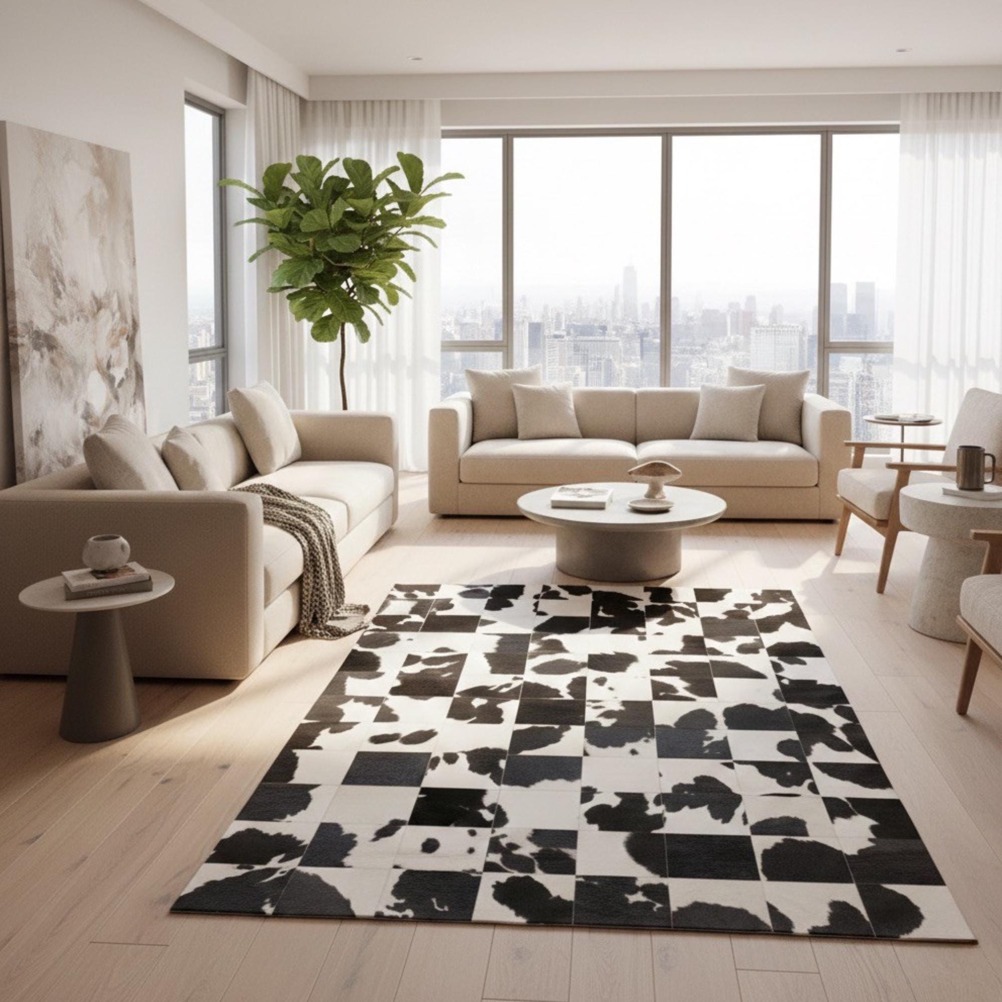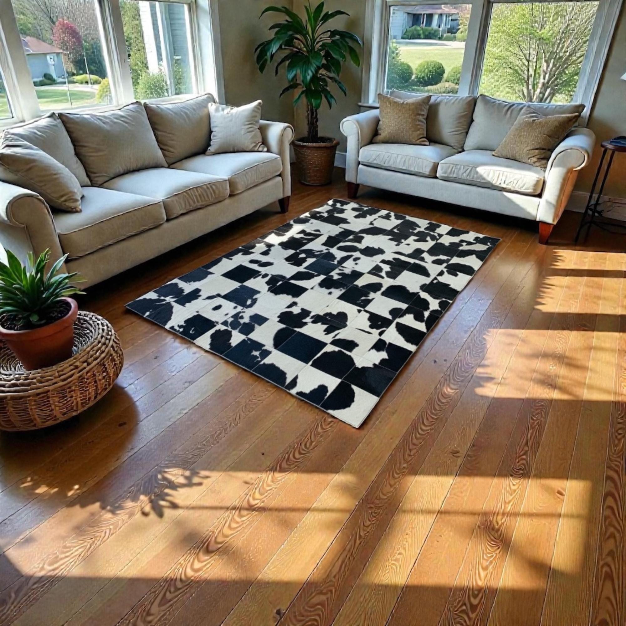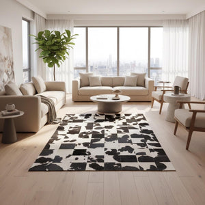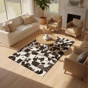 Bej zemin üzerinde siyah ve kahverengi dana derisi parçaların düzensiz dağılımıyla tasarlanan patchwork halı, kontrastlı yapısıyla dikkat çeken bir zemin etkisi sunar. Gerçek dana derisinden üretilen bu halı, doğal renk geçişleri ve özgün desen yapısıyla mekâna hareket ve karakter katar.