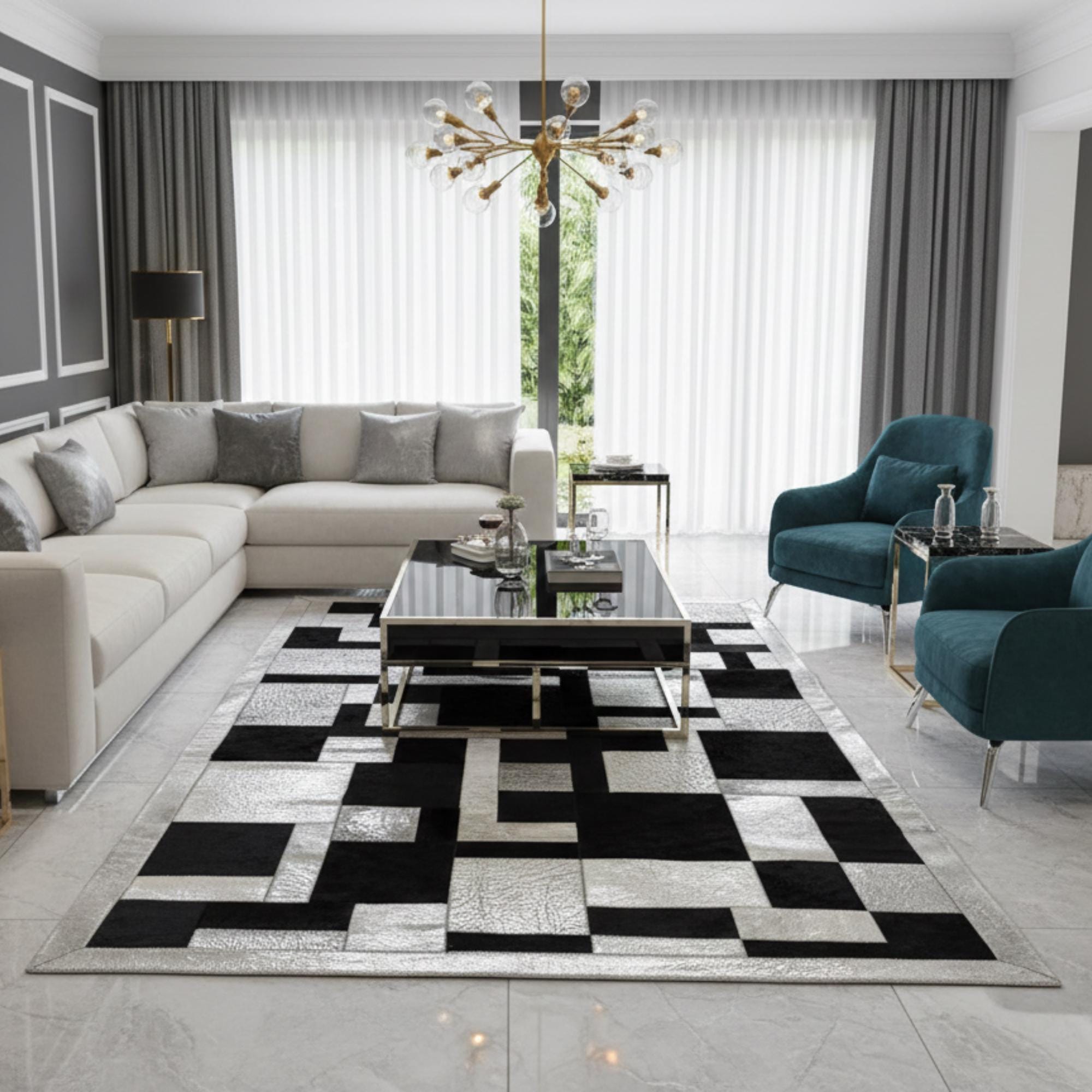 Siyah ve beyaz tonların güçlü kontrastıyla tasarlanan dana derisi patchwork halı, geometrik kare düzeni sayesinde modern ve net bir görünüm sunar. Gerçek dana derisinden üretilen bu halı, sade renk yapısı ve dengeli deseniyle mekânda güçlü bir zemin etkisi oluşturur.