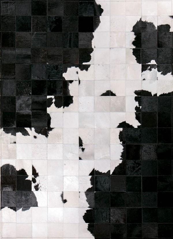 Beyaz Siyah Dana Derisi Patchwork Halı – El Yapımı Hakiki Deri Modern Dekoratif Halı