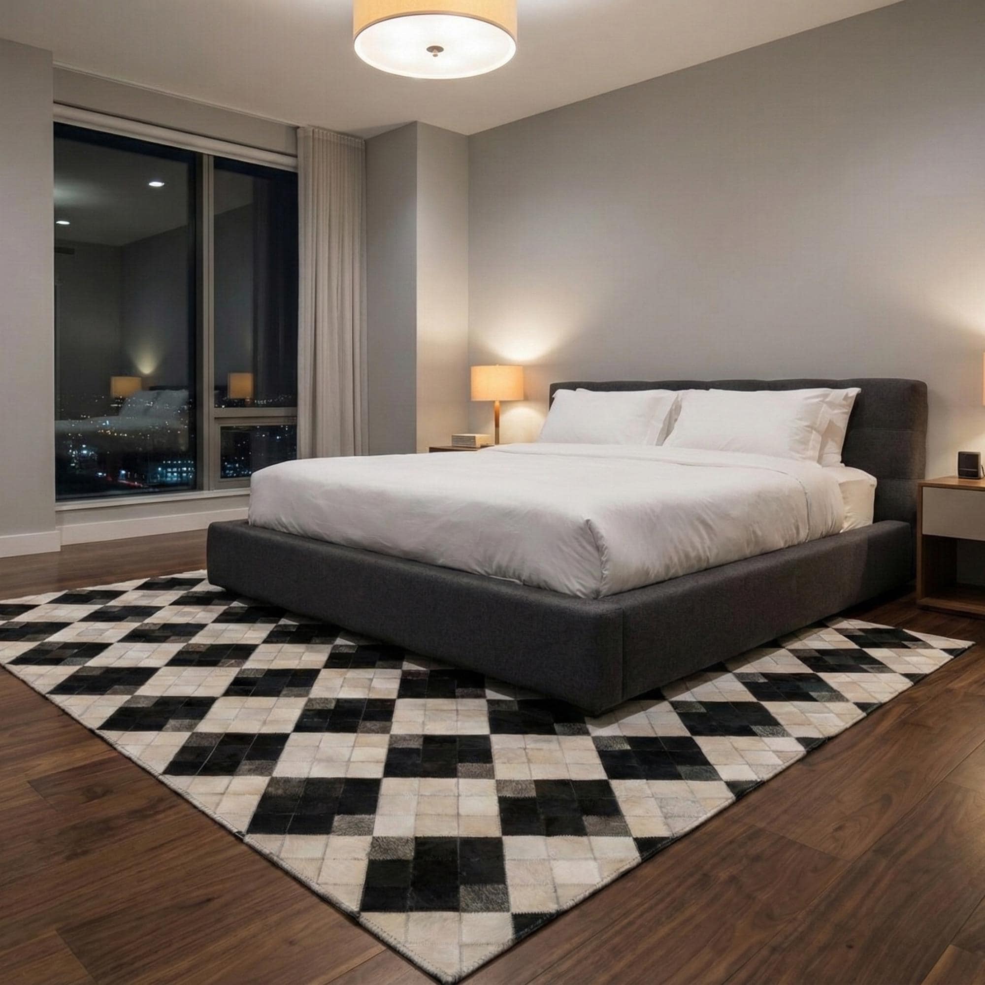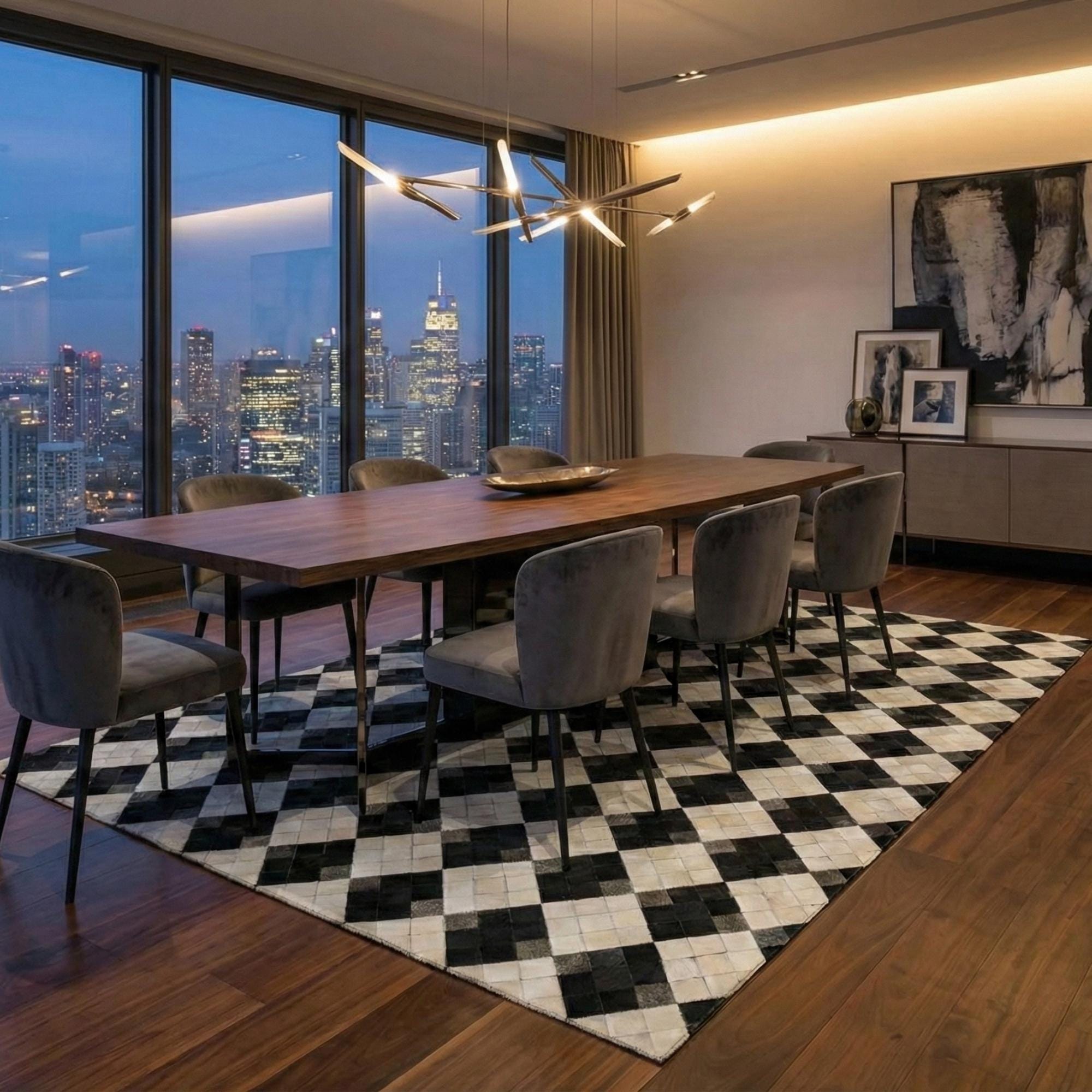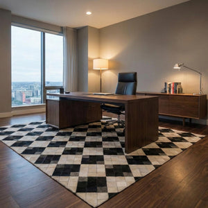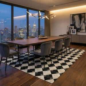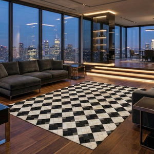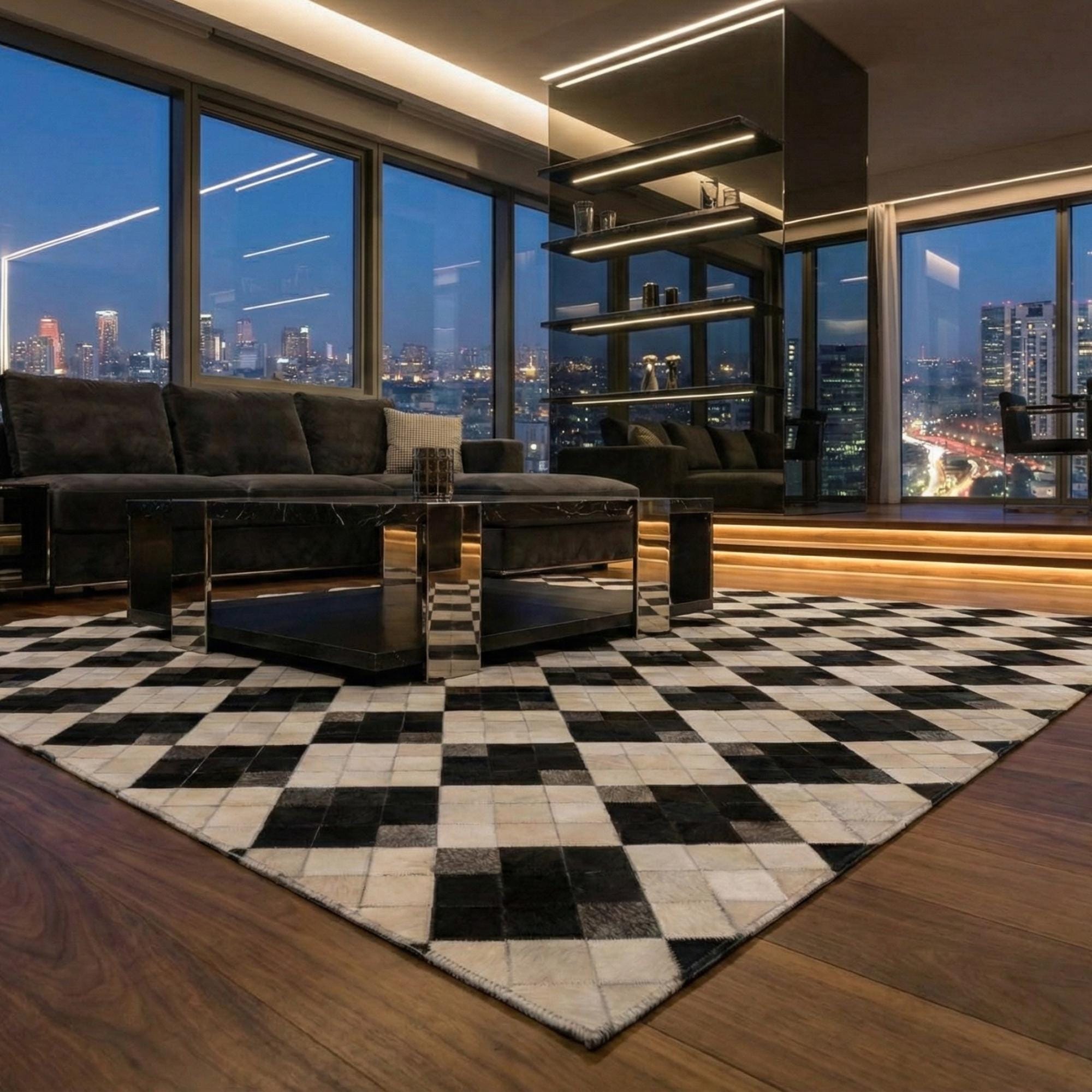 Siyah ve krem tonların kontrastıyla tasarlanan dana derisi patchwork halı, düzenli kare formu sayesinde güçlü ve dengeli bir görünüm sunar. Gerçek dana derisinden üretilen bu halı, sade renk yapısıyla modern ve zamansız bir zemin etkisi oluşturur.