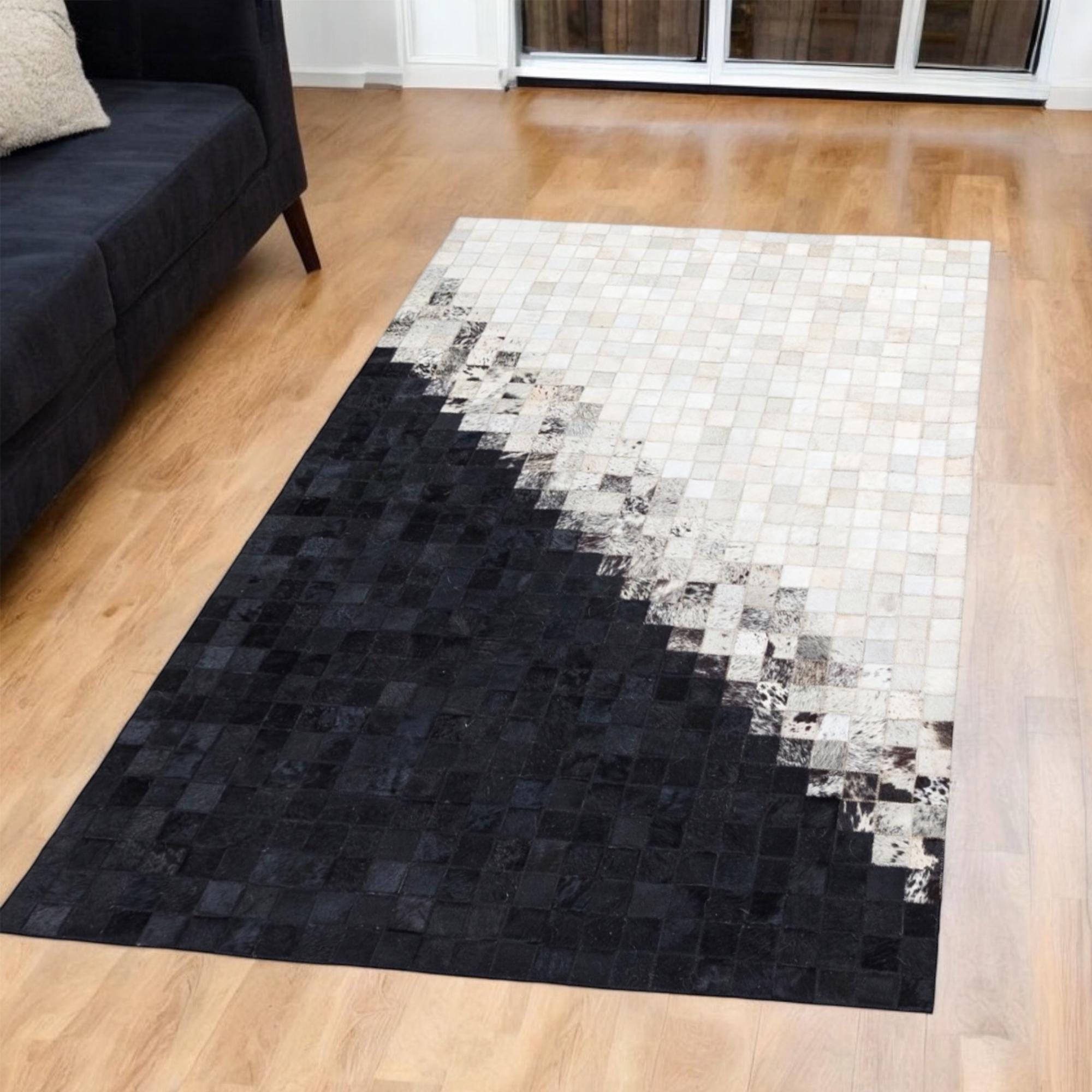 El Yapımı Siyah Bej Patchwork Halı – Lüks Dana Derisi Yatak Odası Halısı