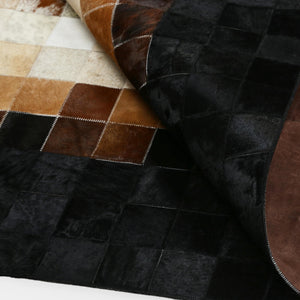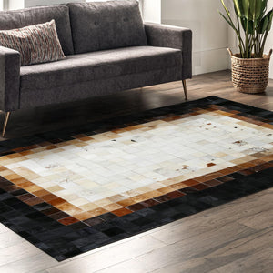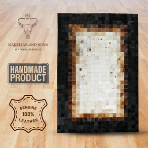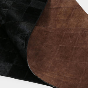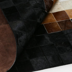 Siyah & doğal tonlara sahip bu dana derisi halı, doğal dokusu ve şık görünümüyle dikkat çeker.