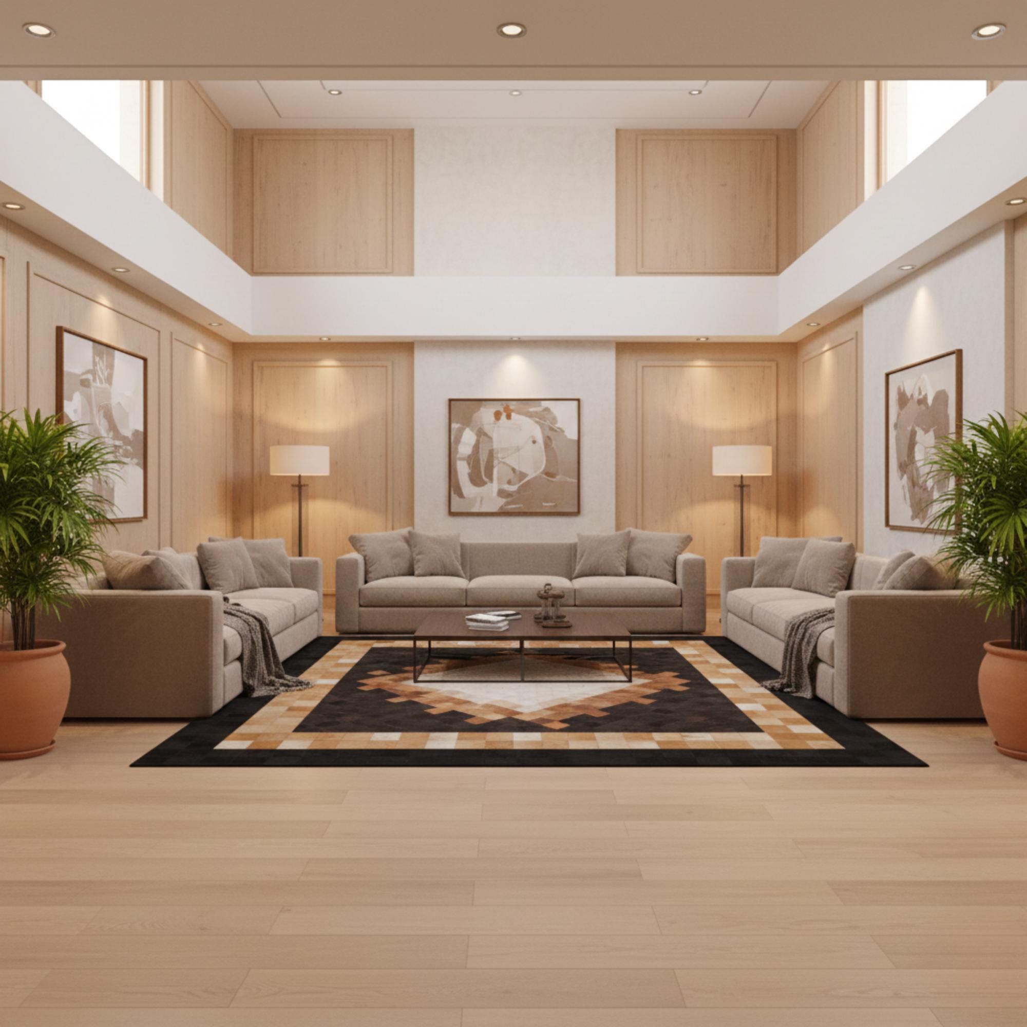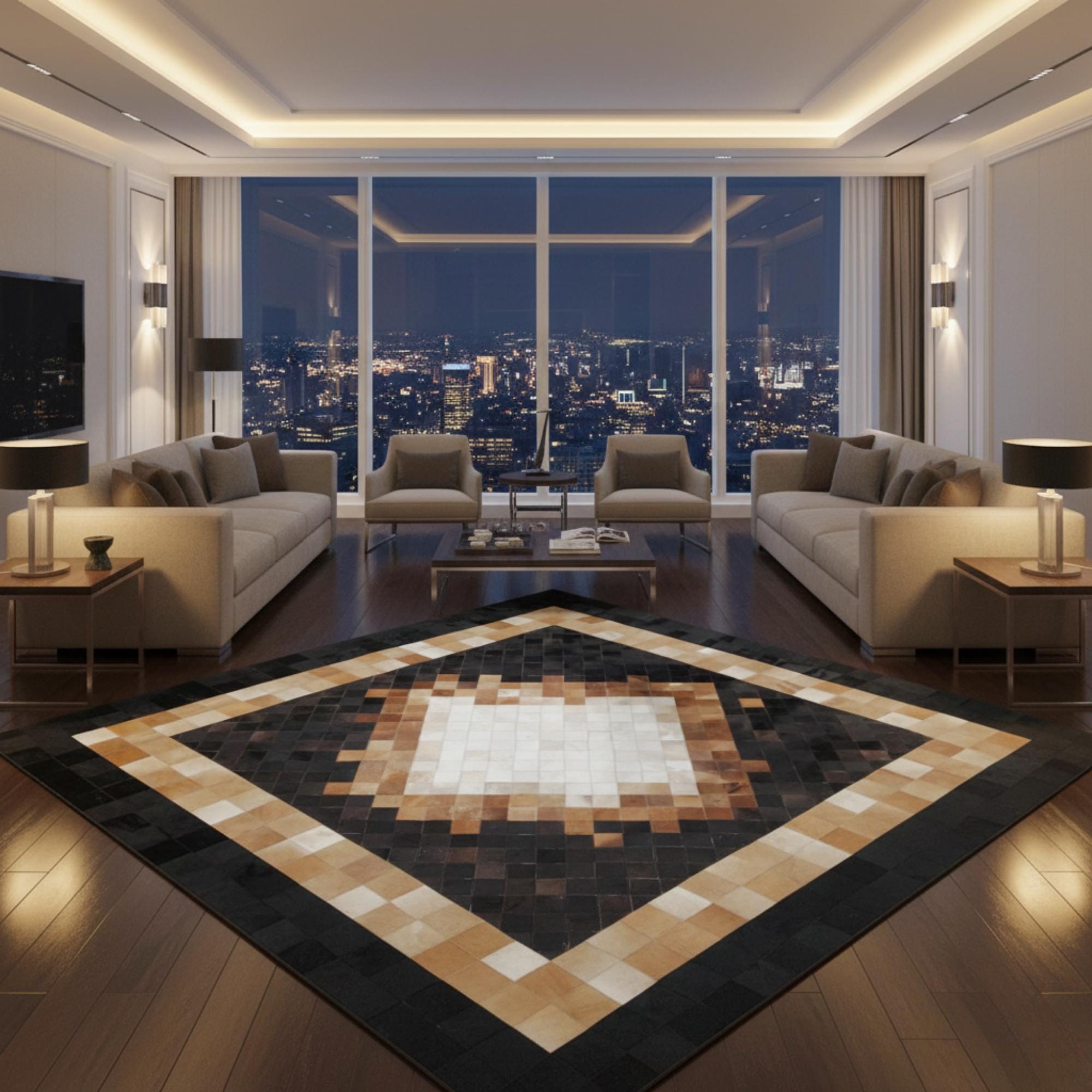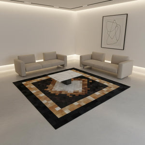 Merkezde açık krem ve bej tonların dengeli geçişiyle tasarlanan dana derisi patchwork halı, çevresindeki siyah ve kahverengi tonlu çok katmanlı çerçevesiyle güçlü bir kontrast sunar. Gerçek dana derisinden üretilen bu halı, düzenli geometrik yapısı ve doğal dokusuyla dikkat çeker.