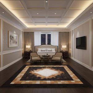 Bej, Kahverengi ve Siyah Tonlu Çerçeveli Dana Derisi Patchwork Halı