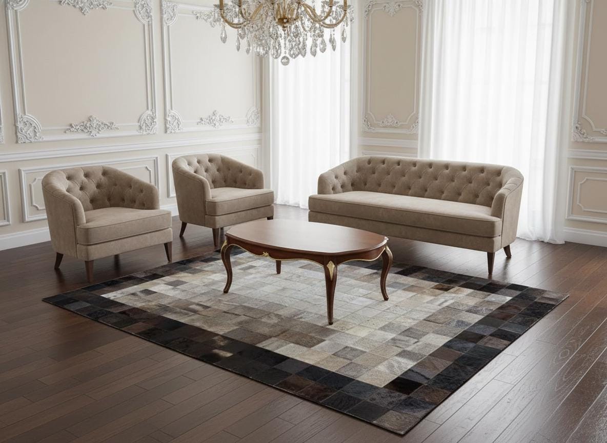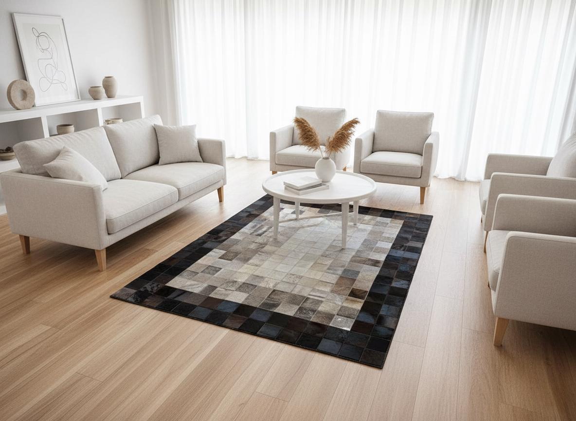 Merkezde açık gri ve bej tonların yumuşak geçişiyle tasarlanan dana derisi patchwork halı, çevresindeki koyu tonlu çerçevesiyle dengeli ve net bir görünüm sunar. Gerçek dana derisinden üretilen bu halı, doğal dokusu ve sade yüzeyiyle öne çıkar.