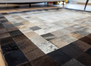Gri ve Bej Tonlu Dana Derisi Patchwork Halı – El Yapımı Doğal Deri Dekoratif Halı