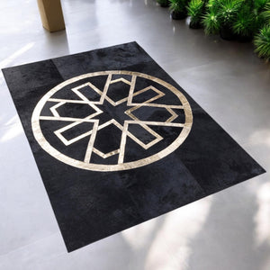 Siyah Altın Dana Derisi Patchwork Halı – El Dokuma Hakiki Deri Lüks ve Şık Salon Halısı