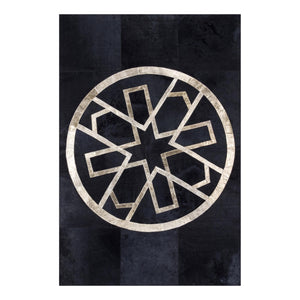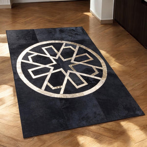 Siyah & altın tonlara sahip bu dana derisi halı, doğal dokusu ve şık görünümüyle dikkat çeker.