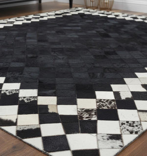 Siyah ve Beyaz Açık Tonlu Bordürlü Dana Derisi Patchwork Halı – El Yapımı Doğal Deri Dekoratif Halı