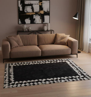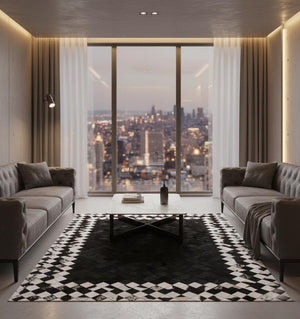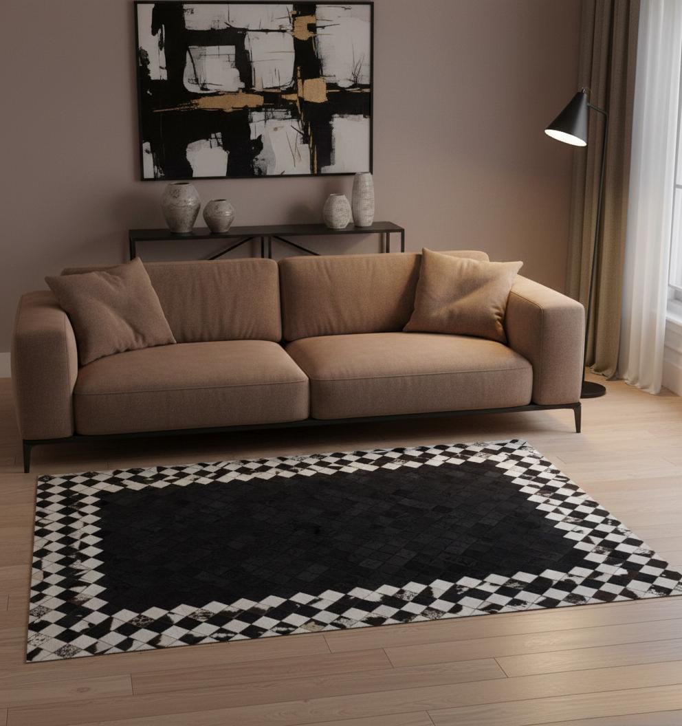 Siyah zemin üzerine açık tonlu geometrik bordür detayıyla tasarlanan dana derisi patchwork halı, güçlü kontrastı ve düzenli yüzeyiyle öne çıkar. Gerçek dana derisinden üretilen bu halı, doğal dokusu ve net desen yapısıyla dengeli bir görünüm sunar.