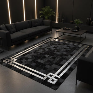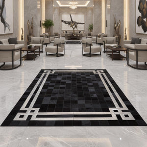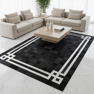 Siyah zemin üzerinde beyaz çok katmanlı geometrik bordür detaylarıyla tasarlanan dana derisi patchwork halı, güçlü kontrastı ve net çerçeve yapısıyla modern bir görünüm sunar. Gerçek dana derisinden üretilen bu halı, düzenli yüzeyi ve sade renk dengesiyle mekânda güçlü bir odak oluşturur.