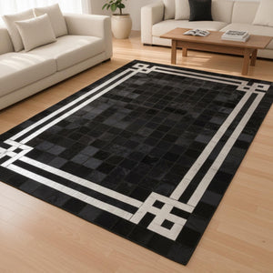 Siyah ve Beyaz Bordürlü Dana Derisi Patchwork Halı – El Yapımı Doğal Deri Dekoratif Halı