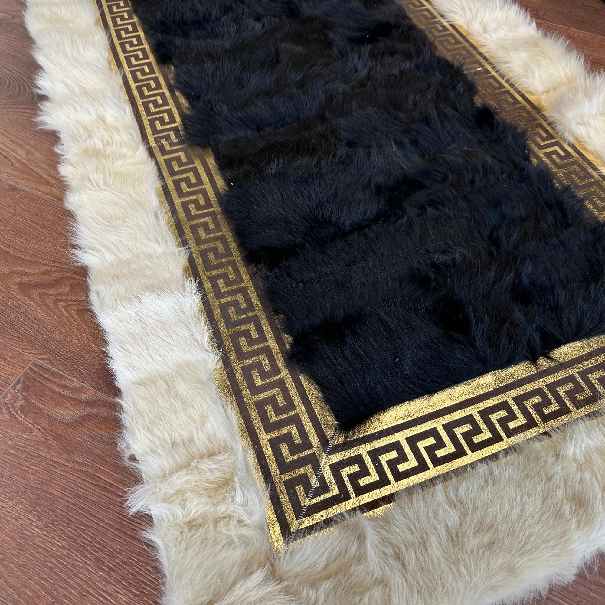 Toskana Derisi Halı – Siyah Orta ve Krem Kenarlı, Altın Bordürlü, El İşçiliği, Doğal Deriden Özel Ölçü Halı